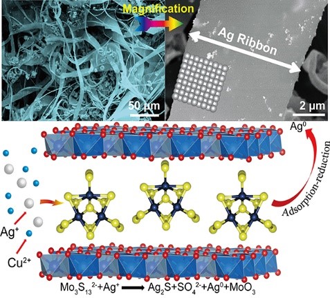 层状双金属氢氧化物(LDH)是一种低成本吸附剂,通过插层和离子交换等方法对LDH功能化,引入与金属离子具有强结合力的活性基团,可大大提高吸附性能。S作为软的路易斯碱,与软路易斯酸的重金属离子具有高的亲和力,可提升对重金属离子的捕获力。本工作通过离子交换方法将多硫阴离子簇Mo3S132-插入LDH层间,开发出一种新型吸附剂Mo3S13-LDH。该吸附剂对Ag+ (1073 mg/g)和Hg2+ (594 mg/g)具有极高的吸附能力和选择性。同时,在高浓度Cu2+体系,该吸附剂对痕量Ag+具有出色的分离能力,为有效地从低品位含银矿物中提取银提供可能。更最重要的是,Mo3S13-LDH可以利用其所含Mo4+和(S2)2-的还原作用, 将Ag+还原为单质银,在不同离子浓度下,可形成微米级银丝及银纳米带,利于批量银单质的分离提取,以及银纳米催化剂的构建。Mo3S13-LDH材料作为一种高效吸附剂,在重金属污染水处理和贵金属提取方面具广阔应用前景。