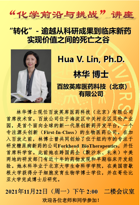 学术报告:百放英库医药科技(北京)有限公司首席技术官,林华博士,“转化”- 逾越从科研成果到临床新药实现价值之间的死亡之谷