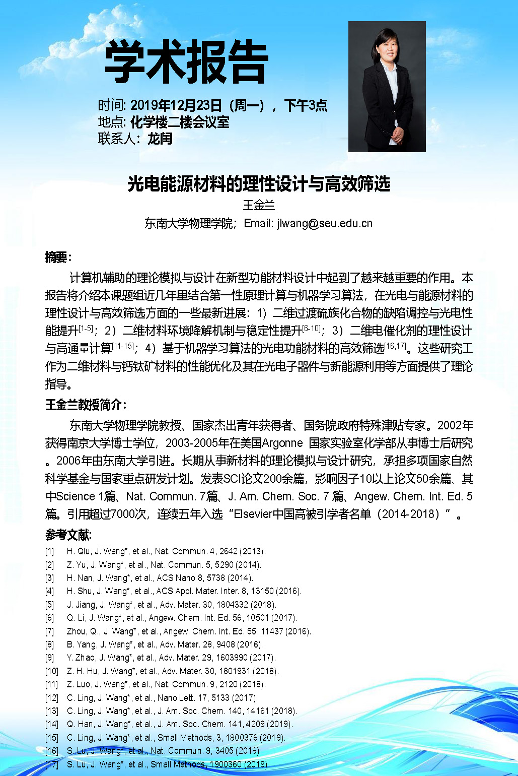 学术报告:东南大学,王金兰教授,光电能源材料的理性设计与高效筛选