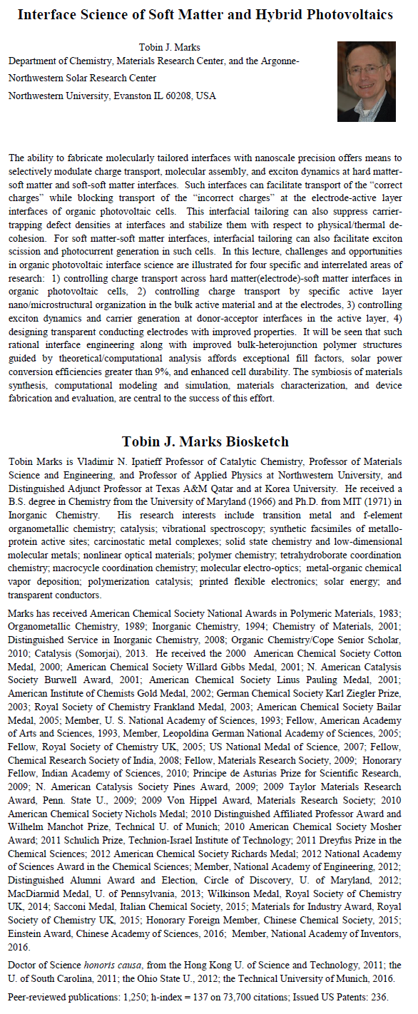 学术报告:美国西北大学,Prof.Tobin J. Marks,Interface Science of Soft Matter and Hybrid Photovoltaics