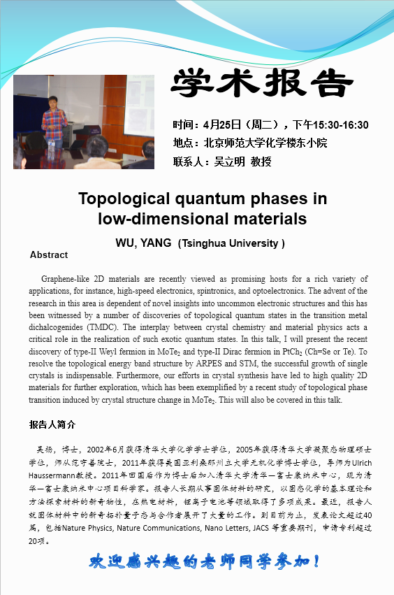 学术报告:Tsinghua University ,WU YANG,Topological quantum phases in low-dimensional materials