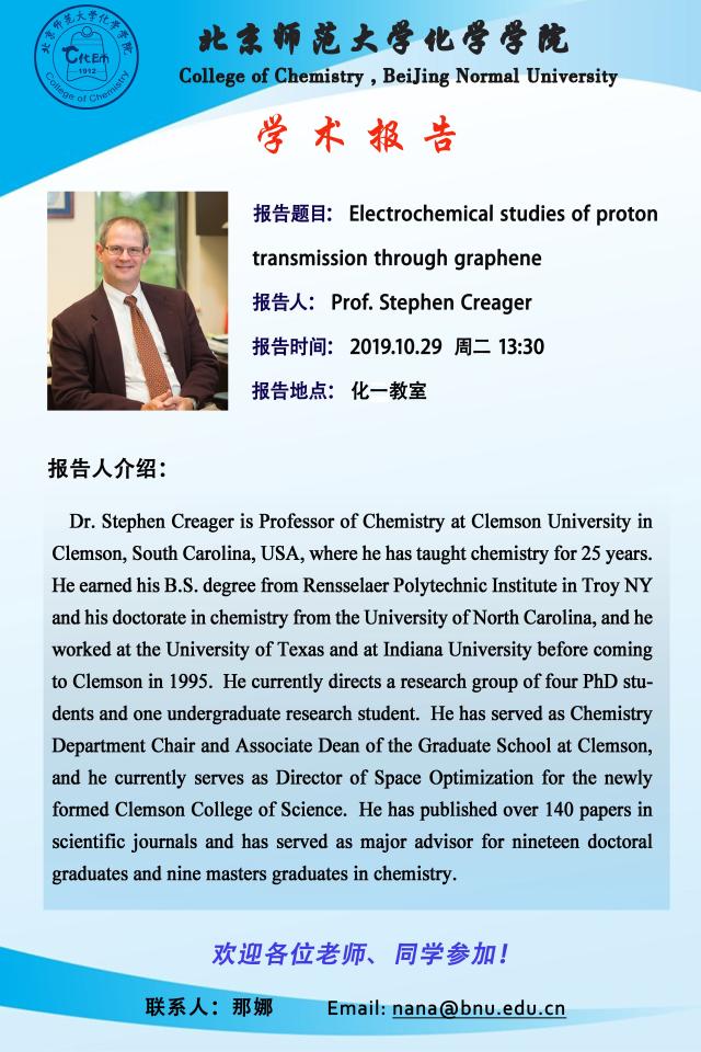 学术报告:Clemson University,Prof.Stephen Creager,Electrochemical studies of proton transmission through graphene