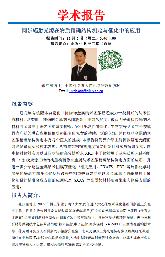 学术报告:中国科学院大连化学物理研究所,张江威博士,同步辐射光源在物质精确结构测定与催化中的应用