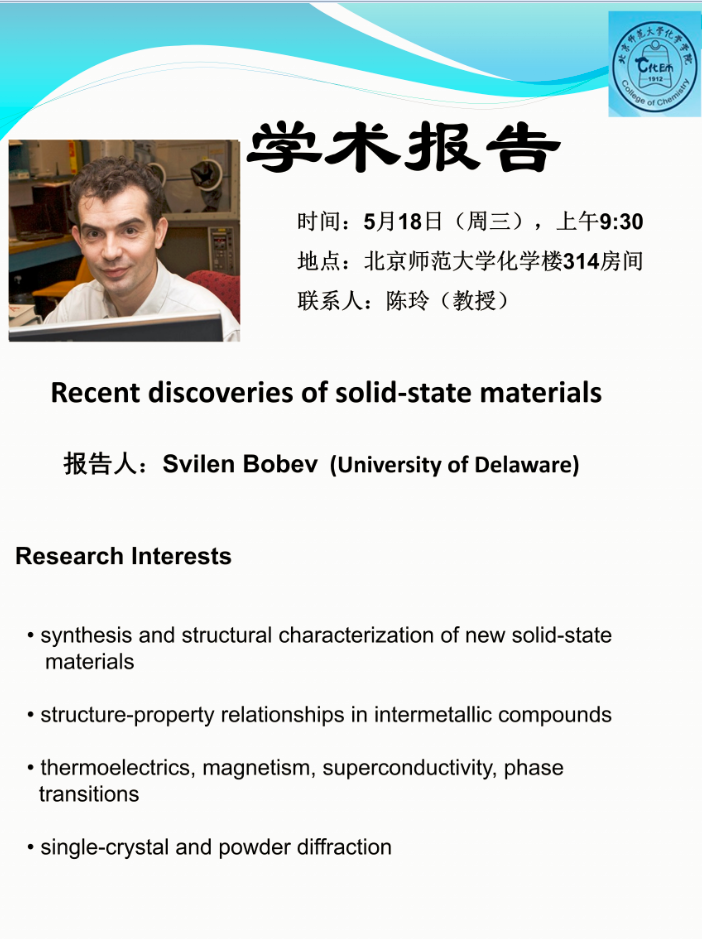 学术报告:University of Delaware, Prof.Svilen Bobev, Recent discoveries of solid-state materials