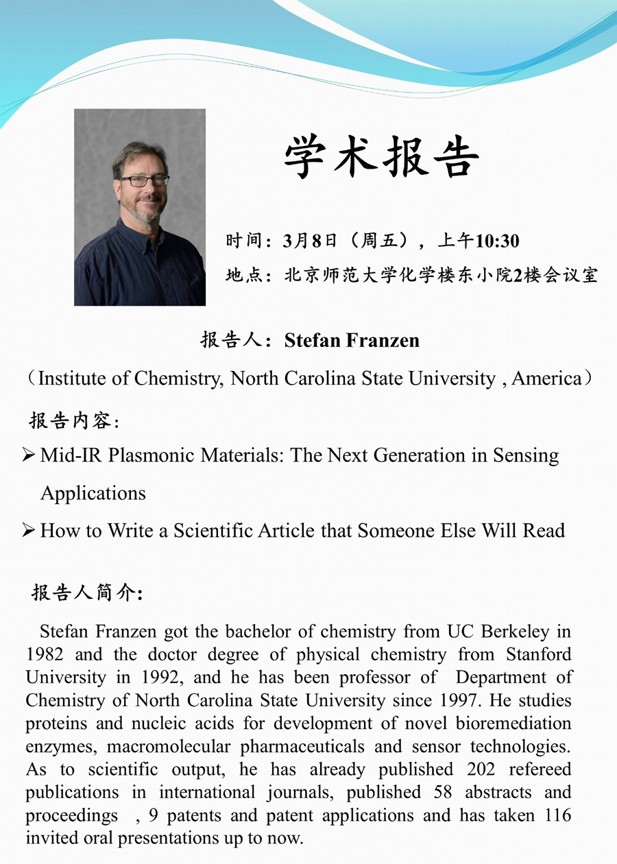 学术报告:美国北卡州立大学,Prof.Stefan Franzen,Mid-IR Plasmonic Materials in Sensing Applications