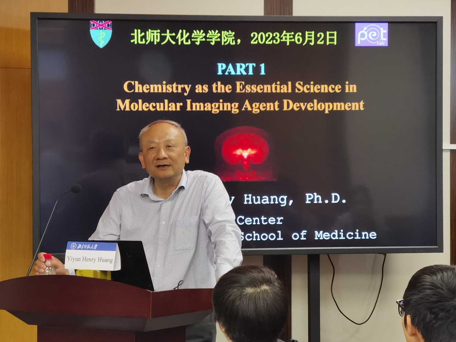 Prof. Yiyun Henry Huang是国际知名的正电子药物和放射化学领域的专家,长期致力于新型正电子放射性药物的研发。Prof. Yiyun Henry Huang以可以应用于早期检测阿尔兹海默症等疾病的电子示踪剂11C-UCB-J为例,讲述了团队的研究工作,让同学们进一步了解了放射性药物化学方面的基础知识、示踪剂的作用机理和特点、科学研究的过程等。Prof. Yiyun Henry Huang还分享了自己从大学开始接触化学的心路历程和经验,启发同学们“Success is never final. Failure is never fatal. Courage is what counts.”(丘吉尔)。结合中国传统古诗词勉励同学们珍惜青春,以饱满的热情努力学习,指出同学们现在处于“独上高楼,望尽天涯路”的阶段,要经过“衣带渐宽终不悔”长期努力钻研的阶段,最终达到“蓦然回首,那人却在,灯火阑珊处”的成就。在互动交流环节,Prof. Yiyun Henry Huang耐心解答同学们的问题,现场气氛热烈。