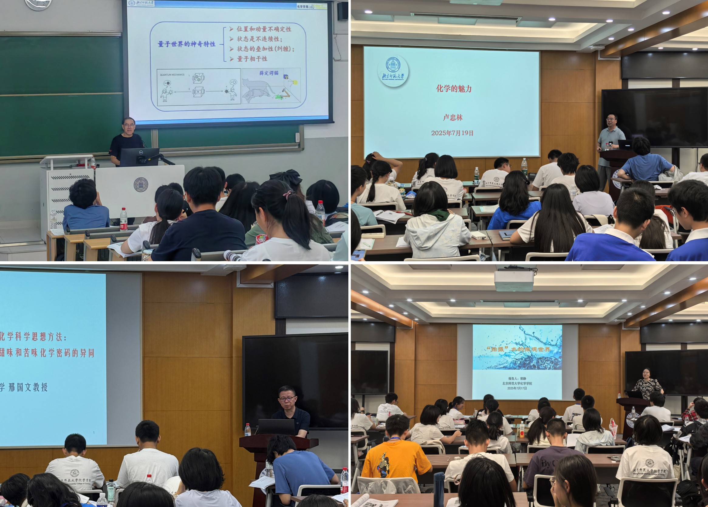 专题报告重在科学思维和前沿进展拓展。方维海院士为同学们做了一场有关量子计算和量子计算机的前沿报告,报告内容聚焦前沿,呈现了一系列前沿研究成果,极大地开拓了同学们的视野。卢忠林教授讲授了“化学的魅力”课程,内容涵盖为化学执言、化学研究促进了人类健康、化学研究为人类创造了财富、化学充满神奇等。邢国文教授讲授了“中学化学教学中的化学科学思想方法:运用发散和收敛思维寻找甜味和苦味化学密码的异同”,通过实例和思维方法介绍,向同学们介绍了有机物的结构以及呈现甜味苦味的原因。郭静教授讲授“‘拍摄’水的微观世界”的报告,报告通过生动的画面和水的特殊性质背后的结构原理揭秘微观世界中藏着无数奥秘。