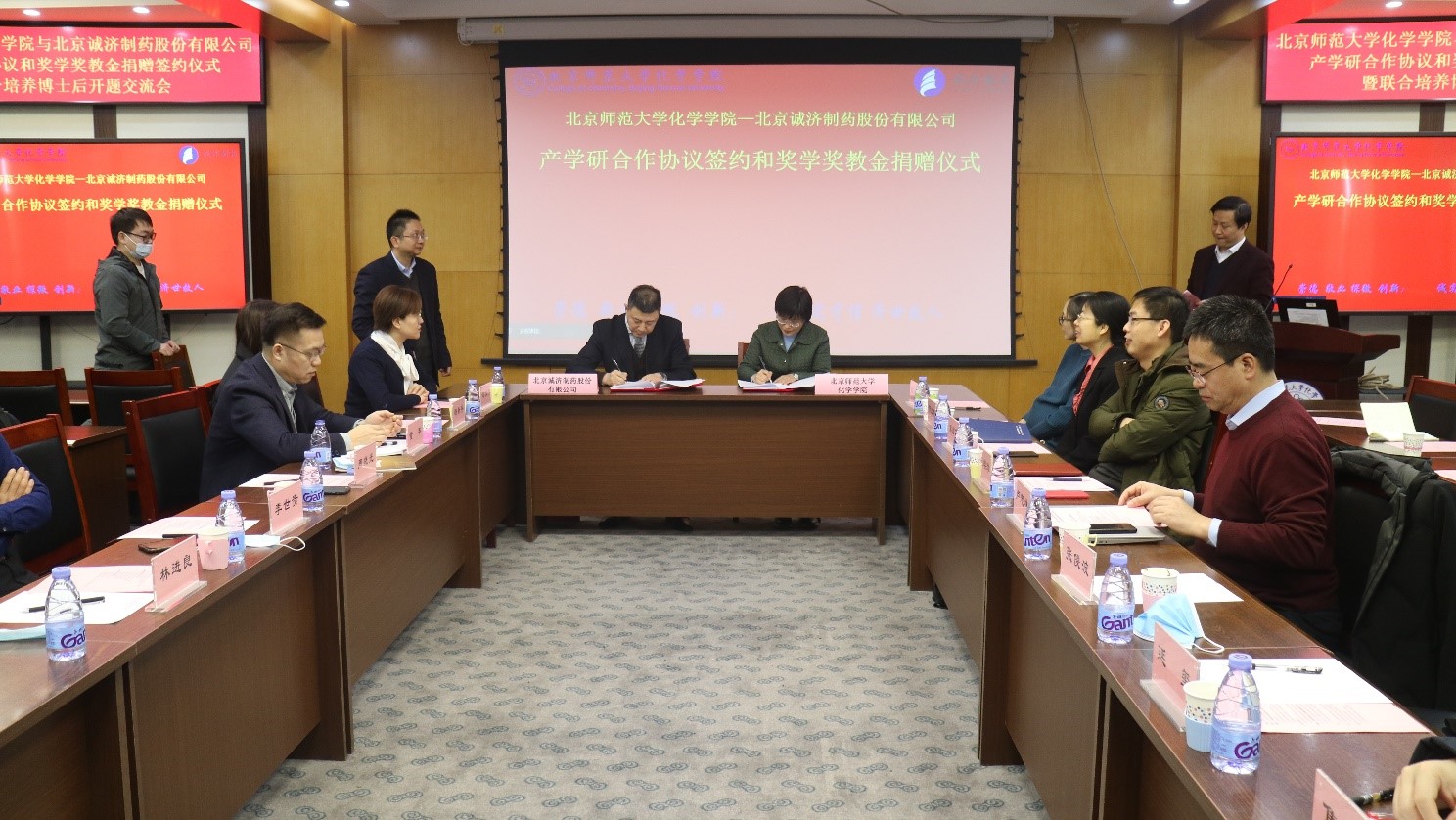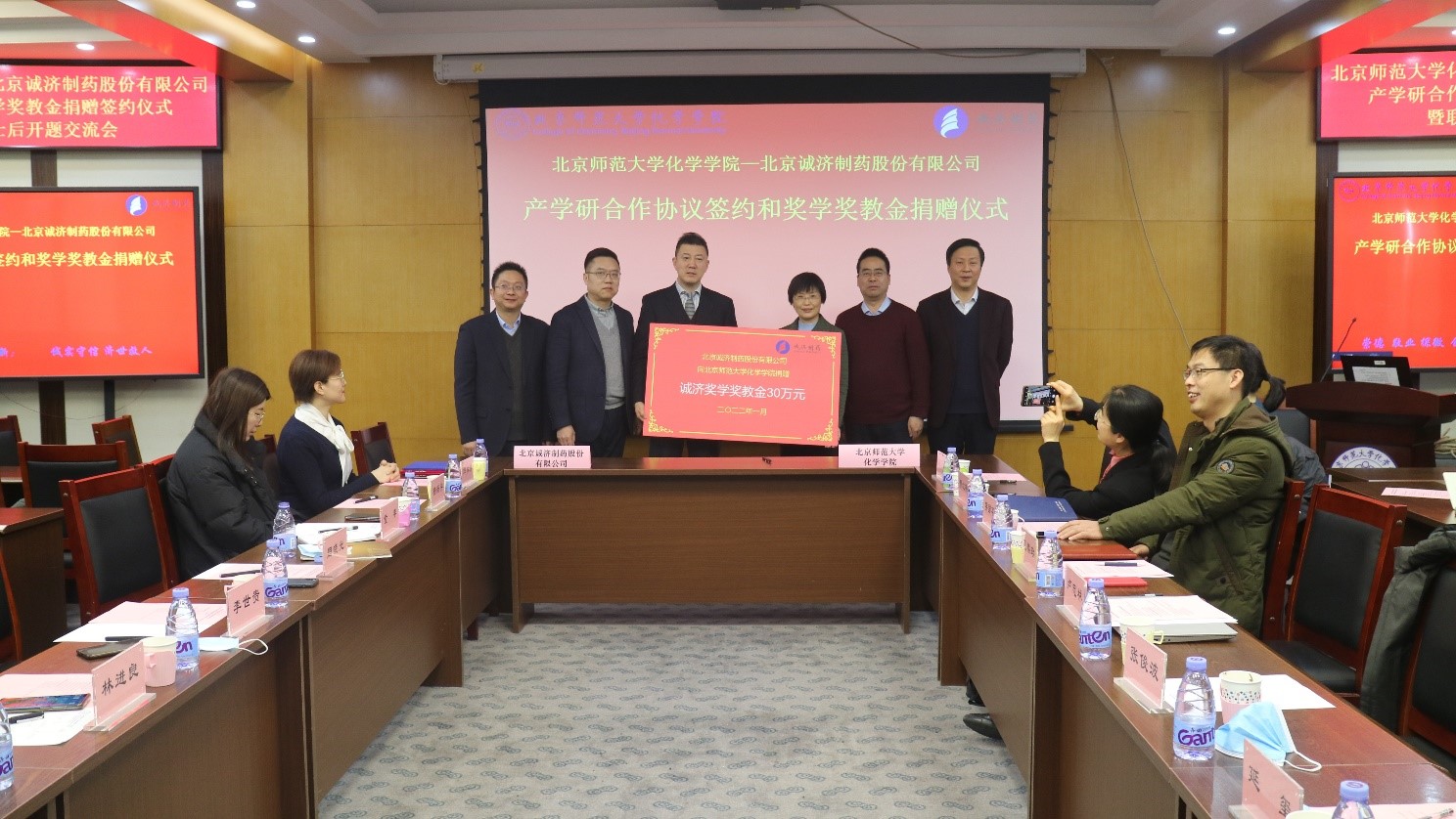 2022年1月12日上午,51吃瓜 与北京诚济制药股份有限公司产学研合作协议签约和奖学奖教金捐赠仪式(暨联合培养博士后开题交流会),在51吃瓜 化学楼顺利举办。北京诚济制药股份有限公司总经理周晓光、副总经理刘立夫、副总经理童丰,51吃瓜 党委书记卢忠林、院长范楼珍等参加上述活动。活动由51吃瓜 副院长张俊波主持,北京市人力资源和社会保障局专业技术人员管理处二级调研员李世贵、顺义区人力资源和社会保障局二级调研员林进良等莅临参与了本次活动。