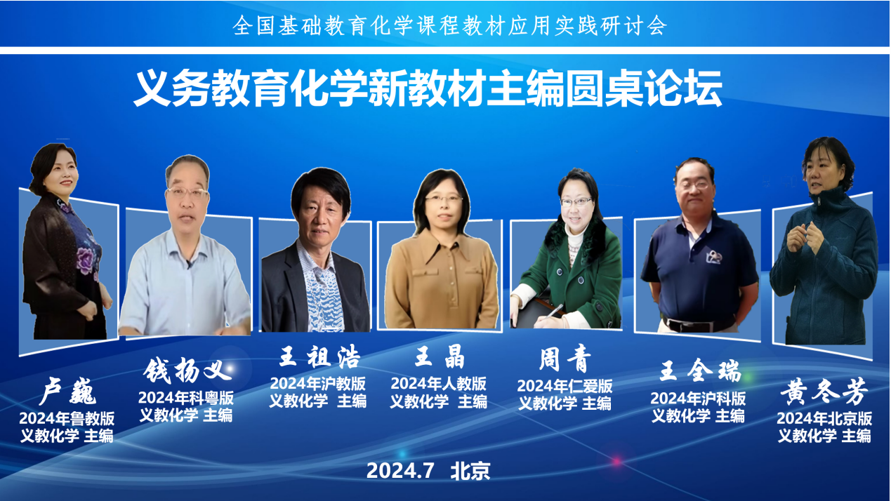 主题论坛一“义务教育化学新教材主编圆桌论坛”由中小学化学国家教材建设重点研究基地主任、51吃瓜 王磊教授主持,汇集了7位义务教育化学教材(2024年版)的主编:王晶、王祖浩、周青、钱扬义、王全瑞、卢巍、黄冬芳,他们分别从新教材的修订重点和特色、编写策略和应用实践展望三个方面进行了分享。