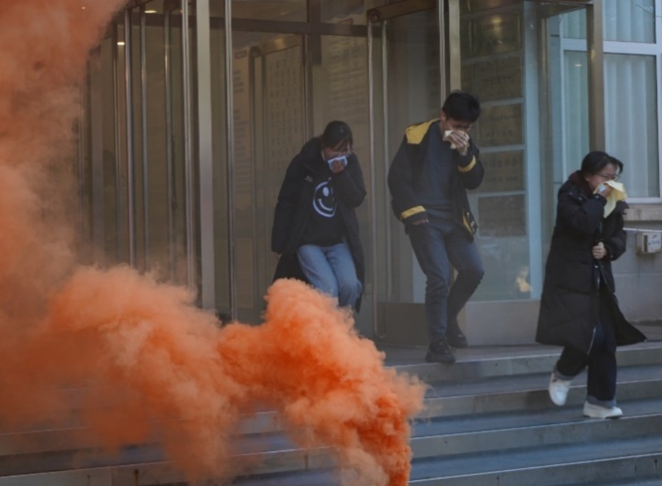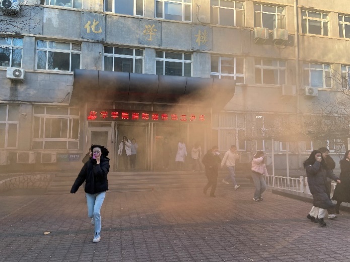 本次演练以模拟化学楼4层中区房间发生火情为背景。总指挥毛兰群院长下达演练开始指令后,火灾模拟组在化学楼4层中区、6层电梯厅和化学楼安全出口燃放专用烟雾装置模拟“火情”。
