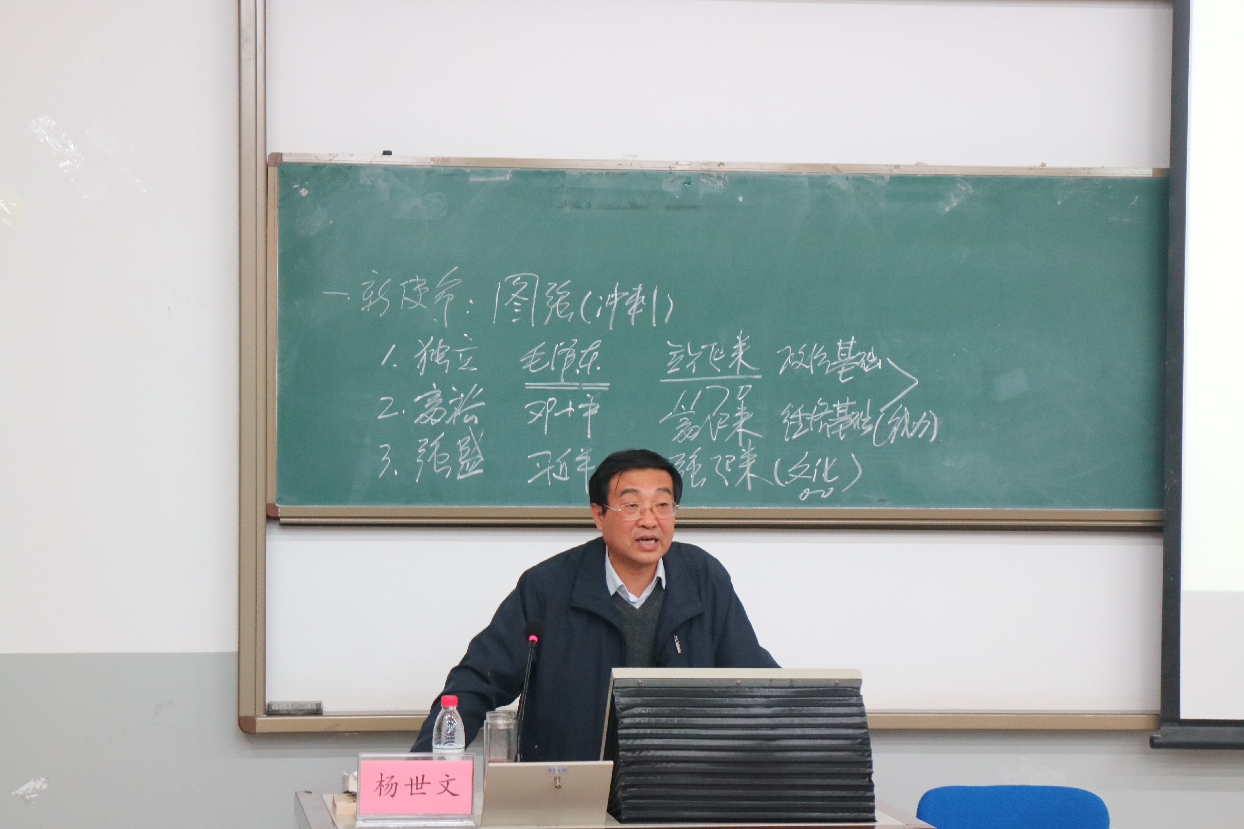 党的十八大以来,以习近平同志为总书记的党中央,围绕什么是社会主义现代化强国,怎样建设社会主义现代化强国的基本问题,提出了一系列新思想、新战略、新理念,初步形成了习近平治国理政的思想体系,把马克思主义中国化提到了新境界。杨老师结合习近平主席系列重要讲话,从新使命、新布局和新理念三个方面入手详细讲解了习近平主席的治国理政新方略。杨老师指出毛泽东主席带领我们实现了民族独立人民解放,为社会主义建设提供了政治基础;邓小平总书记带领我们走向富裕,为社会主义建设提供了经济基础;在新的时代中国的发展目标已经从求富转向图强,而且是以文化振兴、科技强大为基础的国家强盛。他强调,创新是国家强盛的主要驱动力,而广大师生的创新的生力军。接着,杨老师结合时事热点,以风趣的语言、独特的视角对“中国梦”的奋斗目标、“四个全面”的战略布局,“创新、协调、绿色、开放、共享”的发展理念做了深刻的解读。