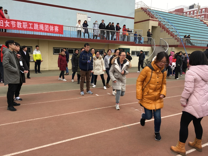 2018年3月7日下午,校工会在东操场举办了庆“三八国际劳动妇女节”团体跳绳比赛,我院获得了三等奖。为了迎接此次比赛,我院工会组织教师赛前积极备战,所有参赛选手都认真对待每一次练习,在训练中提高了自身的跳绳水平,培养了相互间的默契,增进了感情。在比赛中,大家努力拼搏,默契协作,坚持到底,拉拉队的老师呐喊助威、欢声笑语,大家切实体会到了体育锻炼和团体活动带来的乐趣。在大家的共同努力下,我院参赛选手发挥出了较高水平,取得了好成绩。这次活动在锻炼身体的同时也提高了老师们的团结意识和协作精神。