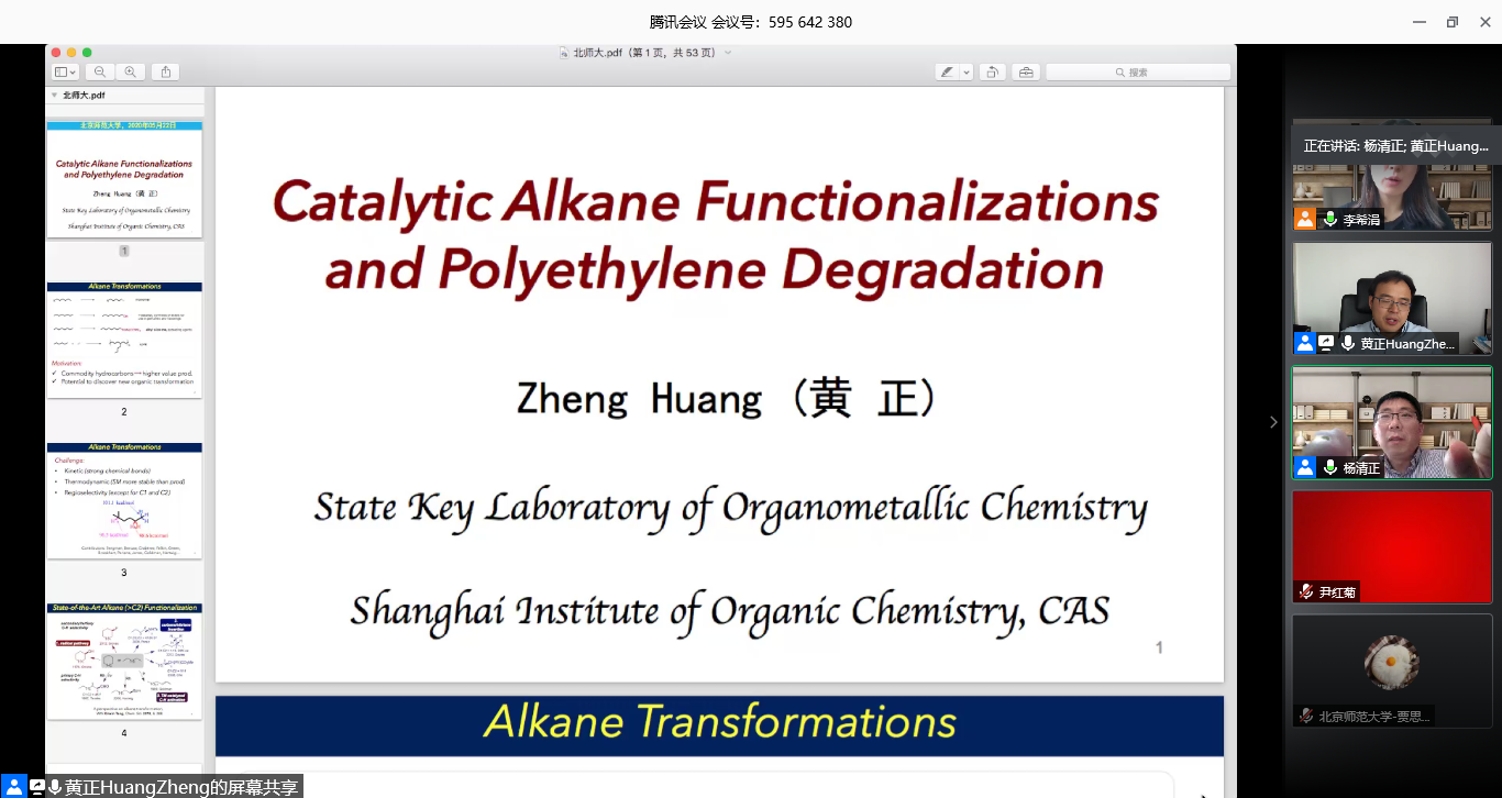 2020年5月22日15:00,BNU化学“云讲堂”第三讲在腾讯会议app上成功举办。本次讲座由上海有机化学研究所黄正研究员主讲,杨清正老师和李希涓老师担任主持人。老师和同学们热情高涨、积极参与,讲座取得了老师和同学们的热烈反响。