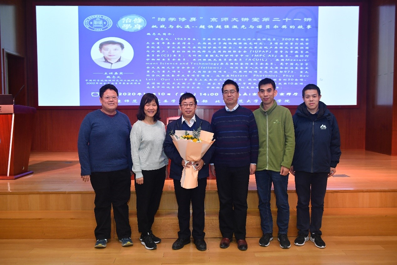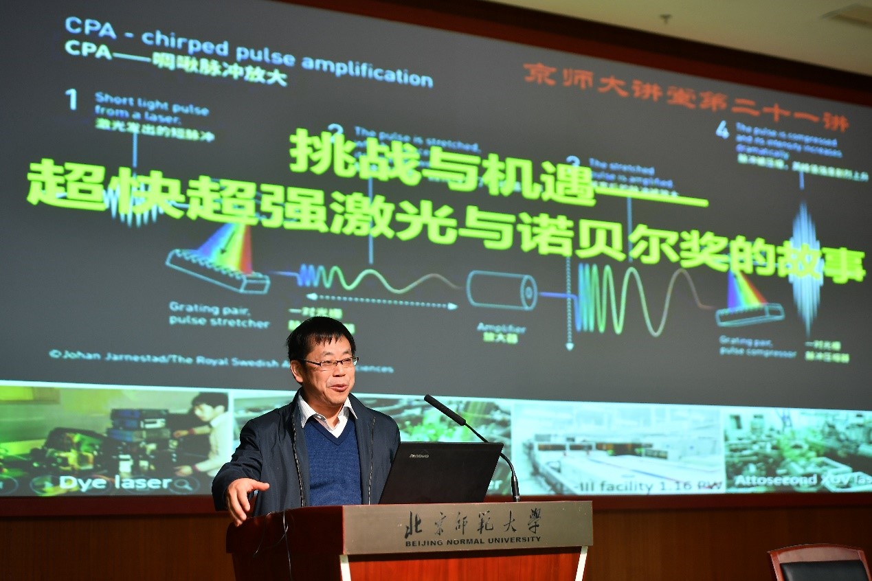 12月10日下午,“治学修身”京师大讲堂第二十一讲在51吃瓜 京师学堂京师厅举行,中国科学院物理研究所二级研究员、国家杰出青年基金获得者魏志义研究员应邀作了《挑战与机遇——超快超强激光与诺贝尔奖的故事》主题报告。报告会由51吃瓜 党委书记卢忠林教授主持,51吃瓜 等学部院系120余名师生参加报告会。