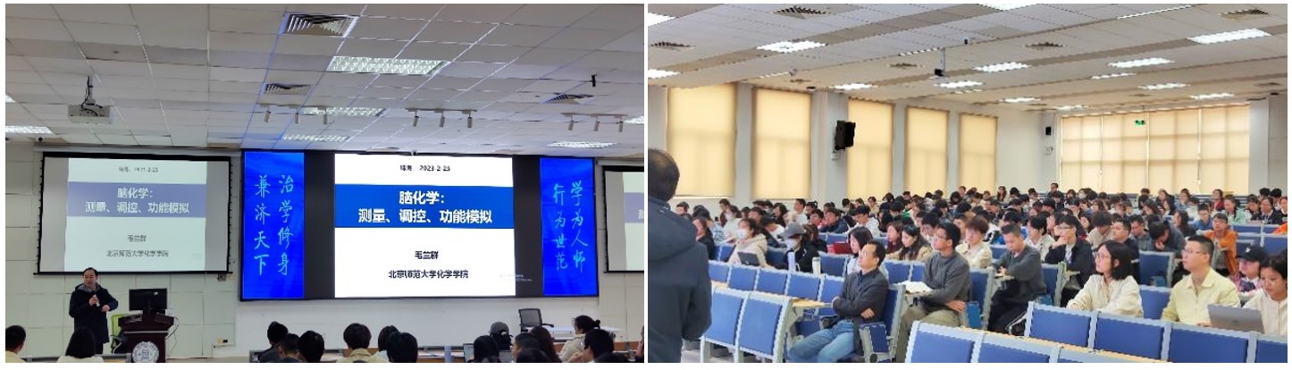 毛兰群教授在讲座中介绍到化学是脑的物质基础,不仅体现在其组成是化学的,而且其功能也是通过化学而实现的。长期以来,脑功能过程中化学基础(简称脑化学)的研究虽被公认为至关重要,但却知之甚少。毛兰群教授一直从事脑化学的探索和研究,旨在通过发展创新的脑化学测量原理和方法,揭示脑功能过程中分子的实时动态变化规律,以期在脑化学的研究中有所发现。在此基础上,进一步开展脑化学的模拟和调控的研究,力争在脑疾病治疗方案和类脑的研究方面有所创造。讲座围绕脑化学,对以下四个研究方面展开了讨论,分别是可测物种局限性;生物兼容性差;研究层次单一;脑化学功能模拟。报告结束后,同学们围绕报告内容展开了热烈的讨论,毛兰群教授为同学们一一进行了解答。通过本次前沿科学讲座,同学们对脑化学有了更清晰的认知,并提升了同学们对科研的兴趣。