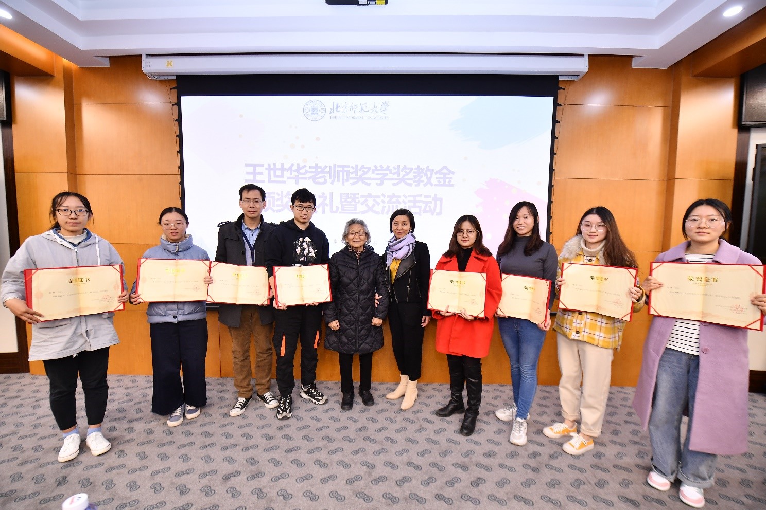 王世华先生和教育基金会副秘书长李胜兰老师共同为获奖师生颁奖,获奖学生代表贾斐代表获奖者发言,表示会牢记王老师的这份爱心,心怀感恩,锐意进取,将王世华老师的关怀和鼓励转化为强大动力,不断学习,了解新知识,掌握新技能,增长新才干,以更优异的成绩回报王老师的善举和关心,回报社会。