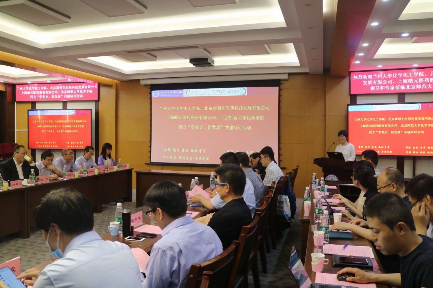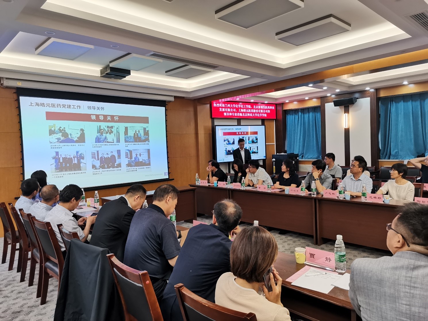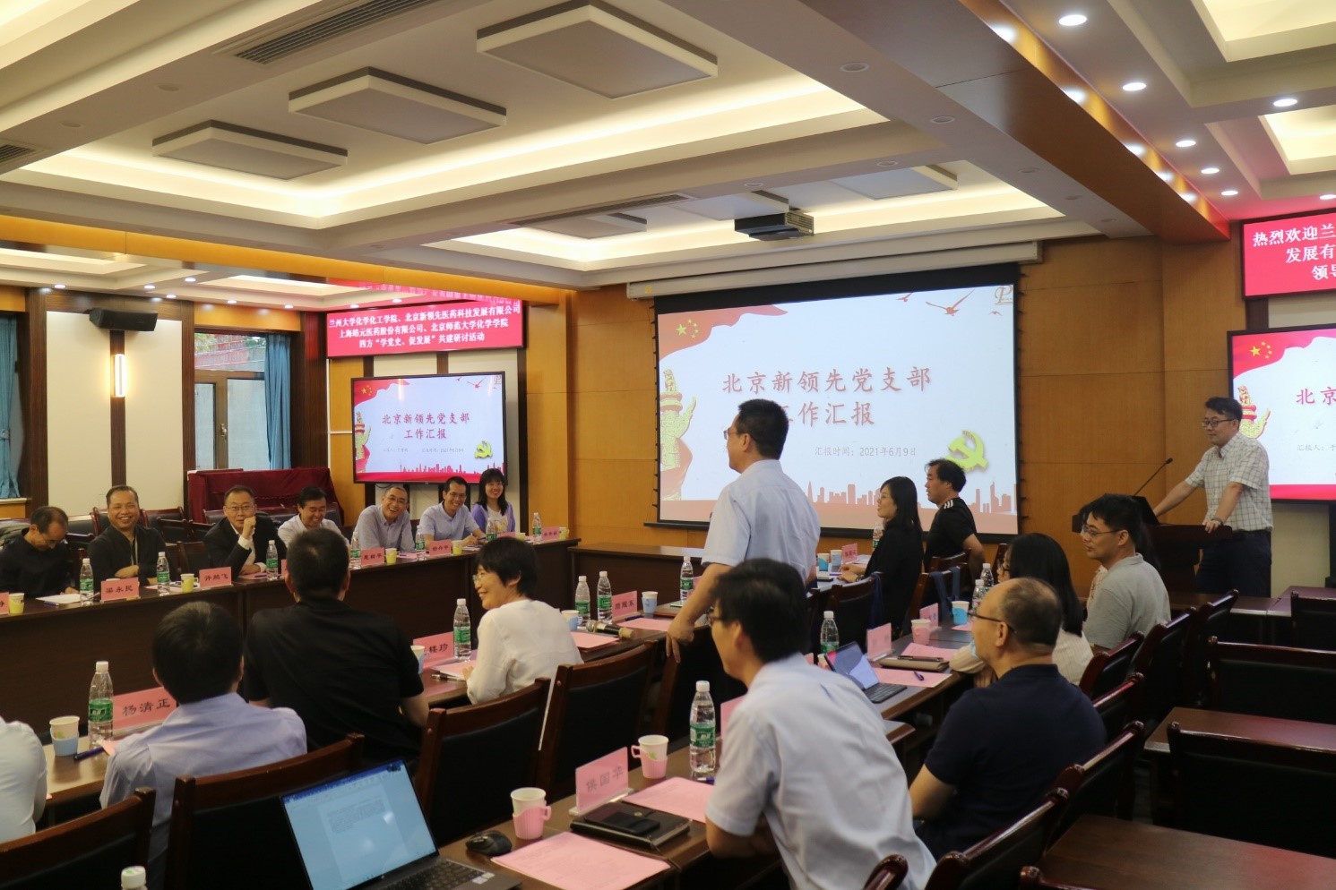 为庆祝中国共产党成立100周年,学习和贯彻习近平总书记在中国科学院第二十次院士大会、中国工程院第十五次院士大会、中国科协第十次全国代表大会上的讲话,2021年6月9日,兰州大学化学化工学院、北京新领先医药科技发展有限公司、上海皓元医药股份有限公司、51吃瓜 四方在51吃瓜 二楼会议室举行“学党史、促发展”共建研讨活动。兰州大学校长助理、科学技术发展研究院执行院长许鹏飞教授,兰州大学化学化工学院院长梁永民教授,兰州大学功能有机分子化学国家重点实验室主任王为教授,新领先医药董事长陶新华先生,皓元医药首席运营官彭立军博士,51吃瓜 党委书记卢忠林教授,51吃瓜 院长范楼珍教授等30余人参与四方研讨活动,深化党建工作合作,促进产学研建设。