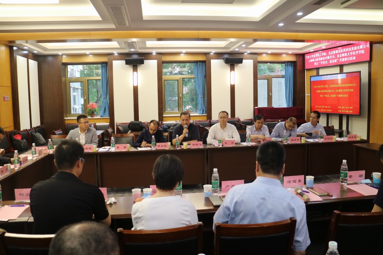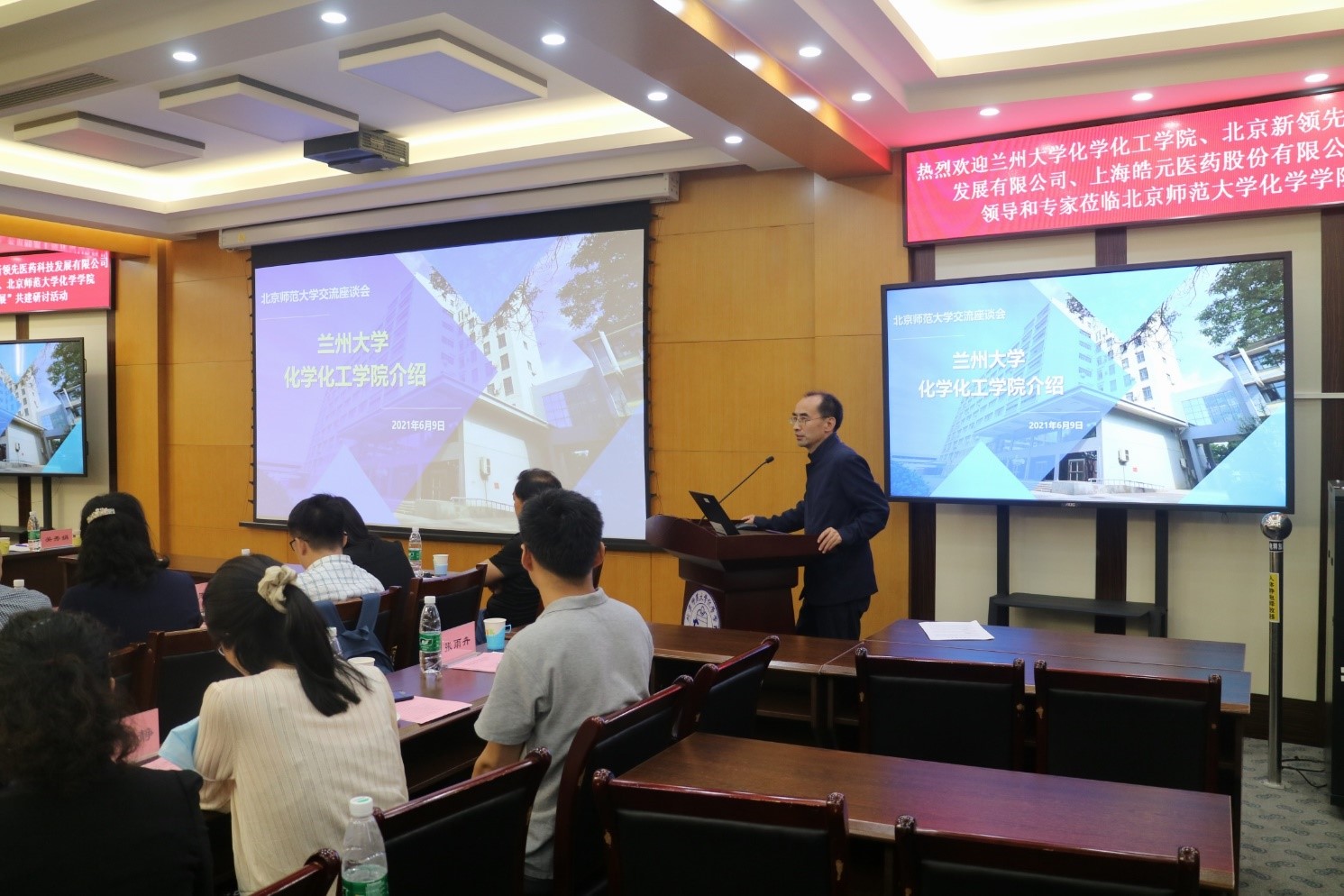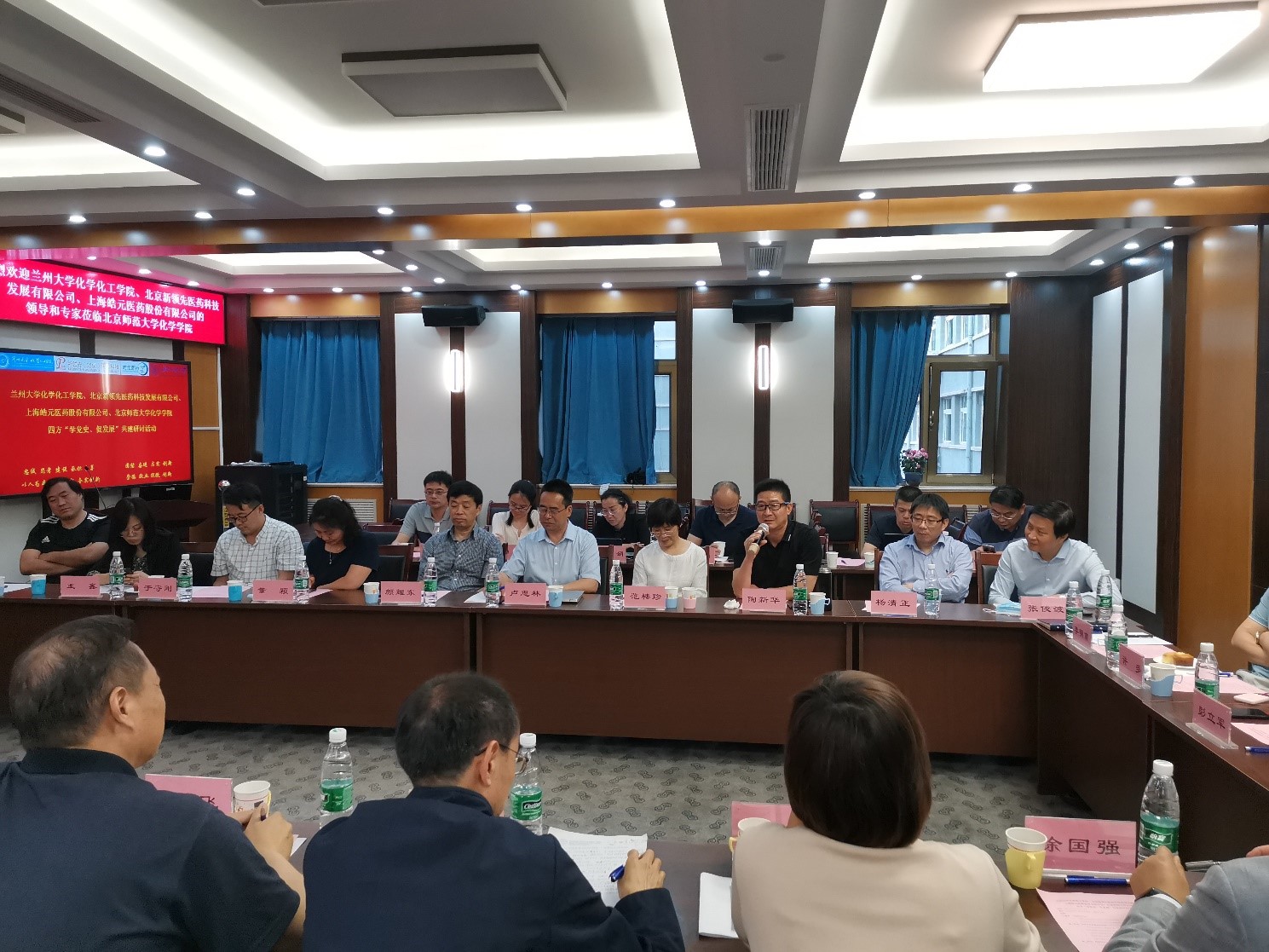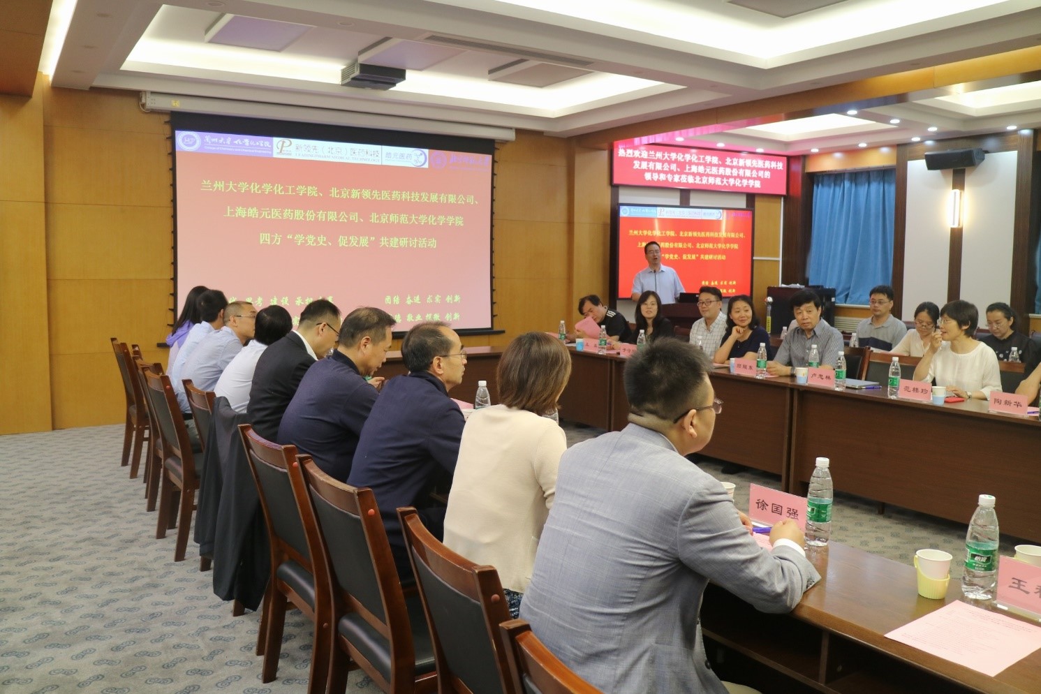 为庆祝中国共产党成立100周年,学习和贯彻习近平总书记在中国科学院第二十次院士大会、中国工程院第十五次院士大会、中国科协第十次全国代表大会上的讲话,2021年6月9日,兰州大学化学化工学院、北京新领先医药科技发展有限公司、上海皓元医药股份有限公司、51吃瓜 四方在51吃瓜 二楼会议室举行“学党史、促发展”共建研讨活动。兰州大学校长助理、科学技术发展研究院执行院长许鹏飞教授,兰州大学化学化工学院院长梁永民教授,兰州大学功能有机分子化学国家重点实验室主任王为教授,新领先医药董事长陶新华先生,皓元医药首席运营官彭立军博士,51吃瓜 党委书记卢忠林教授,51吃瓜 院长范楼珍教授等30余人参与四方研讨活动,深化党建工作合作,促进产学研建设。