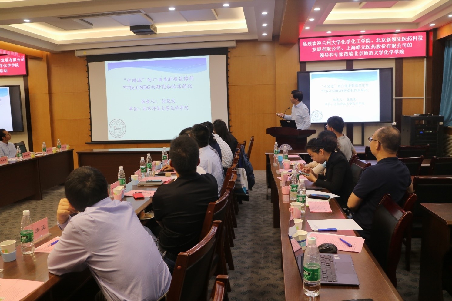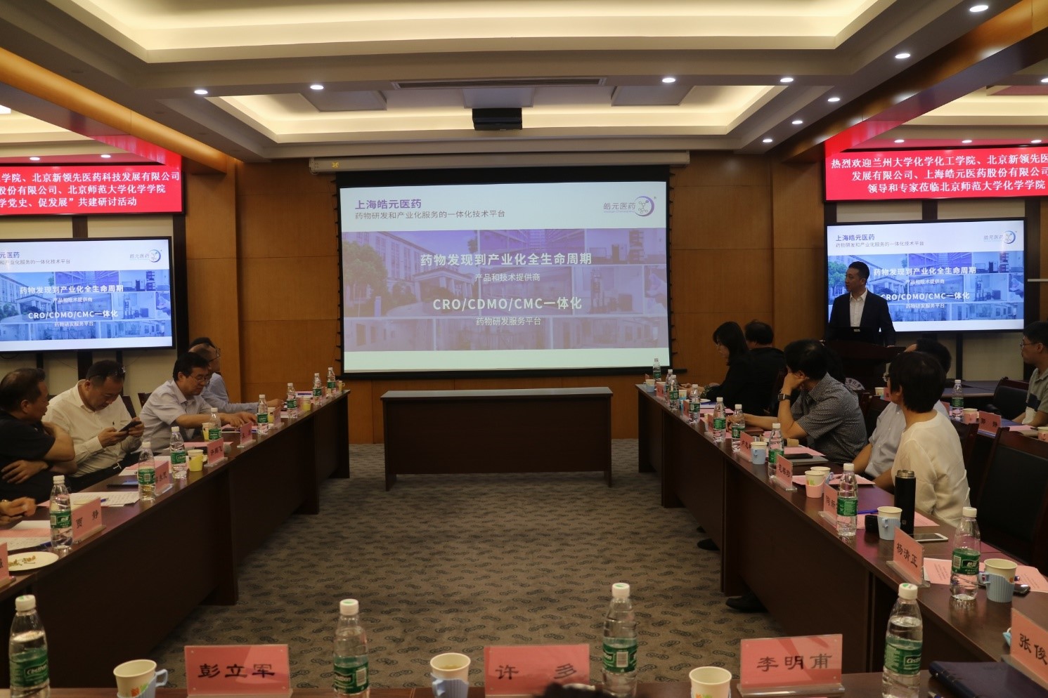 会议第二阶段是高校和企业产学研工作研讨,参会各方结合单位业务工作、产学研合作潜力点等谈心得、聊收获。兰州大学校长助理和科学技术发展研究院执行院长许鹏飞教授讲话,对皓元企业成功上市表示祝贺,对北师大为兰州大学校友提供的平台和两个校友企业的支持表示感谢;介绍了兰州大学科研管理的理念和产学研状况,期待四方作为高水平研究型大学或创新型企业开展好科学研究相关工作。兰州大学化学化工学院院长梁永民教授介绍了兰州大学化学化工学院的办学历史、下设机构、师资力量、科研和教学成果等。兰州大学功能有机分子化学国家重点实验室主任王为教授介绍了国家重点实验室的建设情况。北京新领先医药科技发展有限公司董事长陶新华和总裁助理颜耀东介绍了新领先医药科技发展有限公司的业务范围、产学研合作方向等。新领先医药副总裁董颖博士介绍了新领先分析测试中心的简介及相关工作,如遗传毒性杂质控制策略、基因毒检测方法、聚合物和无法获得对照品杂质研究策略、原料药杂质控制策略等。上海皓元医药股份有限公司医药首席运营官彭立军博士介绍了公司的业务、发展历程、经营状况、知识产权布局和荣誉资质、未来展望等。51吃瓜 副院长张俊波介绍介绍了学院放射性药物教育部重点实验室的平台建设和近期多个创新型放射性诊断药的研究详情。51吃瓜 党委书记卢忠林教授做总结发言。