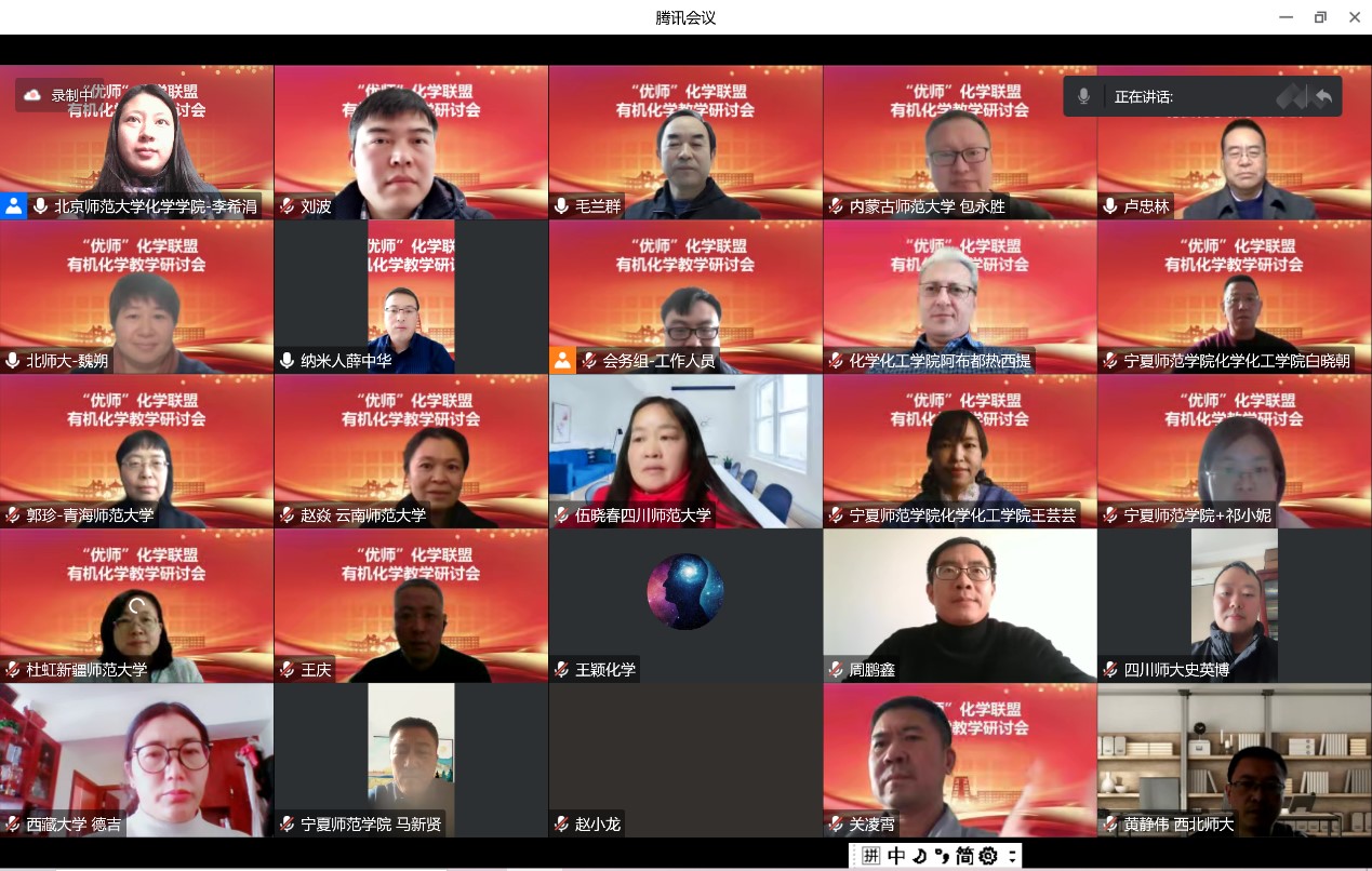 为深入贯彻习总书记“优师”回信精神、落实教育部办公厅 “关于进一步做好‘优师计划’师范生培养工作的通知” ,及时响应2023年全国教育工作会议精神,2023年1月17日下午,51吃瓜 组织多所师范院校化学学科代表在线上举行“优师”化学联盟有机化学教学线上研讨会。四川师范大学化学与材料科学学院、云南师范大学化学化工学院、宁夏师范大学化学化工学院、西北师范大学化学化工学院院、新疆师范大学化学化工学院、内蒙古师范大学化学与环境科学学院、云南大学化学科学与工程学院、青海师范大学化学化工学院、51吃瓜 及珠海校区化学系的党委书记、院长、教学副院长等60余位领导和老师参加会议。