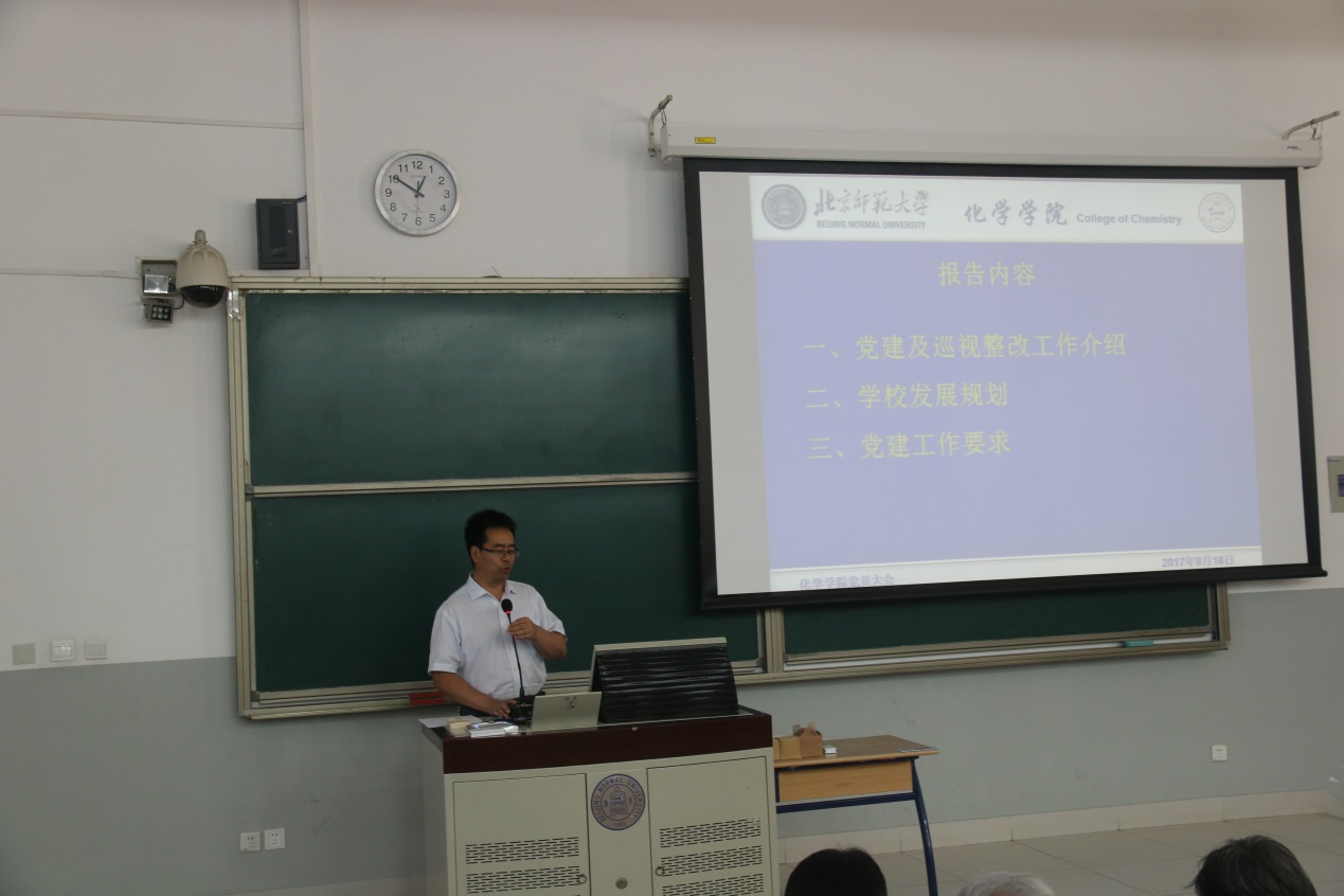 分党委2017年度所做的重点工作,主要包括:夯实党组织建设,加强师生支部共建;开展习近平总书记的治国理政思想和“7.26”重要讲话以及“四个自信”等方面的理论学习;学院“同向同行,共促一流学科建设”暑期党建学科研讨会的情况。接着卢忠林书记介绍了学院积极配合学校和中央巡视组进行巡视整改的有关工作,号召党员们牢记习总书记对北师大提出的“成为巡视整改标杆”的政治嘱托,在意识形态、学风、教风、科研诚信、立德树人和财经纪律等方面严于律己。随后,卢老师向全体党员们介绍了学校未来“一体两翼”的发展规划和近期学校发展的重要举措,鼓励党员们从我做起,围绕教学、科研和社会服务努力学习、刻苦工作,为学校“双一流”建设贡献自己的力量。
