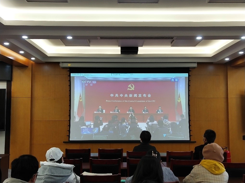 11月12日上午10时,中共中央举办十九届六中全会新闻发布会。51吃瓜 党委书记卢忠林、院长范楼珍、副院长张俊波以及45名师生代表于化学楼二楼会议室实时观看此次发布会的直播。