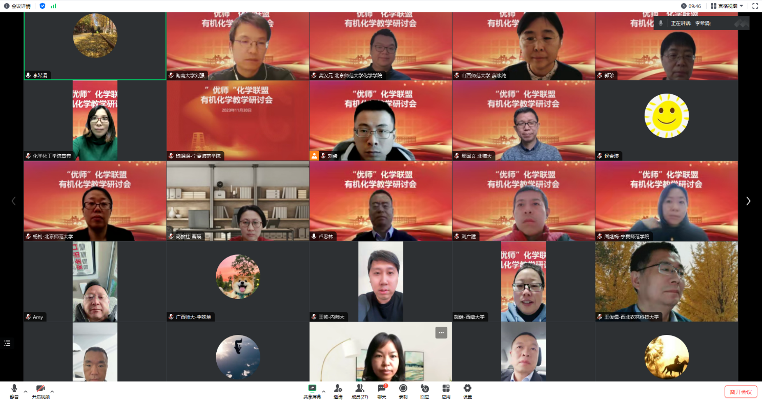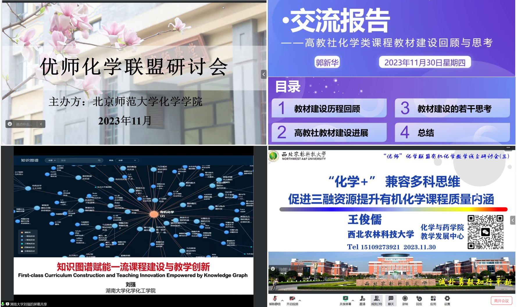 为深入探索“优师计划”化学人才培养规律,进一步提升有机化学教学质量,2023年11月30日,51吃瓜 51吃瓜 组织召开了第三期“优师”化学联盟有机化学教学线上研讨会,此次研讨会以数字化资源建设为主题。51吃瓜 、青海师范大学、内蒙古师范大学、四川师范大学、宁夏师范学院、山西师范大学、西北师范大学、新疆师范大学等多所师范院校有机化学教师代表参加此次研讨活动。