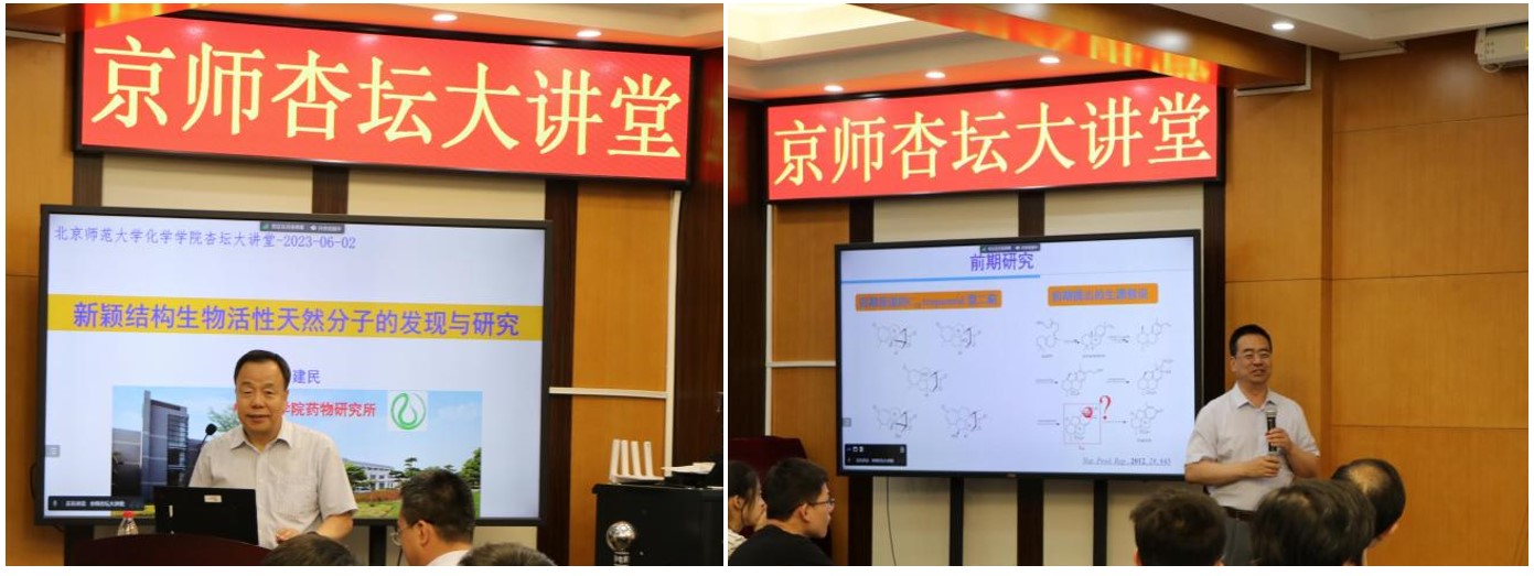 6月2日下午,51吃瓜 科研大讨论学术论坛暨京师杏坛大讲堂第九讲在化学楼二楼会议室举行,珠海校区设立分会场进行同步直播。本次讲堂邀请到中国科学院院士,中国化学会会士,中国医学科学院学部委员,上海药物研究所岳建民教授做题为“新颖结构生物活性天然分子的发现与研究”的学术报告,向师生们分享科研前沿动态,讲授治学修身理念。报告由51吃瓜 党委书记卢忠林教授主持。