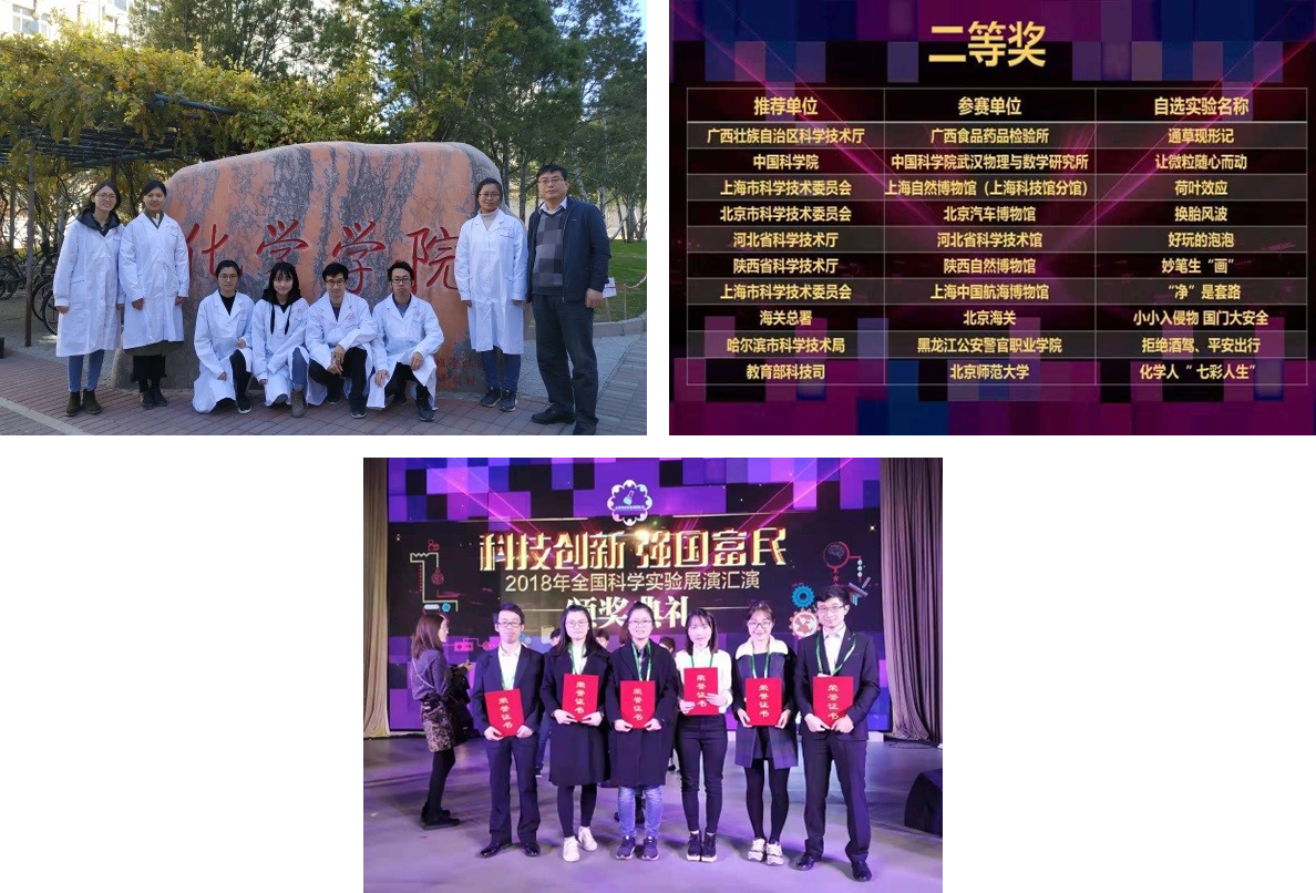 10月30日,由中国科学院科学传播局、科技部政策法规与监督司主办,以“科技创新,强国富民”为主题的2018年全国科学实验展演汇演在中科院物理所举行,来自全国35个参赛单位的96组科学实验展演团队齐聚北京,为公众呈现了一场生动有趣、精妙绝伦的科学表演盛宴,该展演汇演宗旨在于深入贯彻党的十九大精神,弘扬科学精神,普及科学知识,助力科技强国梦。51吃瓜 参赛团队——孙根班课题组和卢忠林课题组联合组成科普团队,以“化学人——七彩人生”为参赛节目,将化学与材料学科交叉领域的学术成果与趣味化学实验相结合,既体现了当前化学领域和材料领域的研究前沿和热点,也表现出了极具观赏性的实验现象。该团队由北师大科技处推荐,教育部科技司进行初选,最终拿到进入决赛的资格。该团队经过一个多月的周密筹备与紧张排练,个人简介VCR制作,在10月30和10月31日两天的激烈角逐最终从专业科普表演队伍中脱颖而出,荣获2018年全国科学实验汇演展演大赛二等奖。据了解,本次比赛共设置10项一等奖,20项二等奖,30项三等奖,其余为优秀奖。