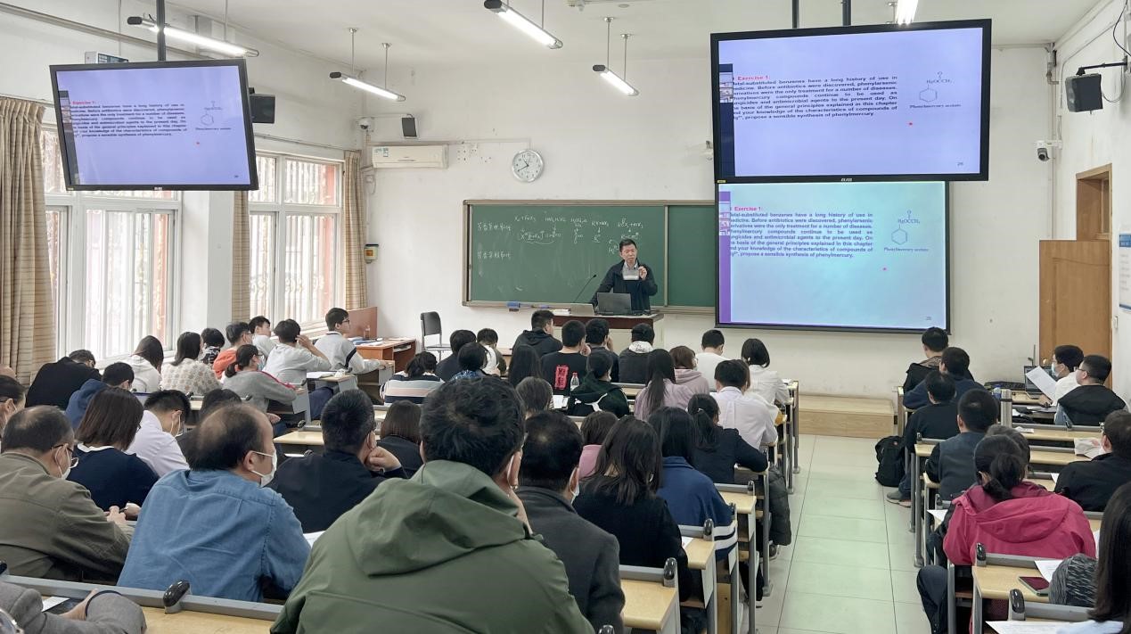4月11日上午10:00-11:40,学院领导以及51吃瓜 全体教师在生四教室观摩了邢国文教授主讲的《有机化学IIA(双语)》课程教学。该课程是本科学位基础课程,授课对象是化学专业大二本科生,教学内容是“芳香亲电取代与芳香亲核取代反应”。邢国文教授是北京市教学名师,为这次观摩课做了充分准备,课堂讲解条理清晰、重点突出、逻辑性强,带给大家诸多启发和思考。