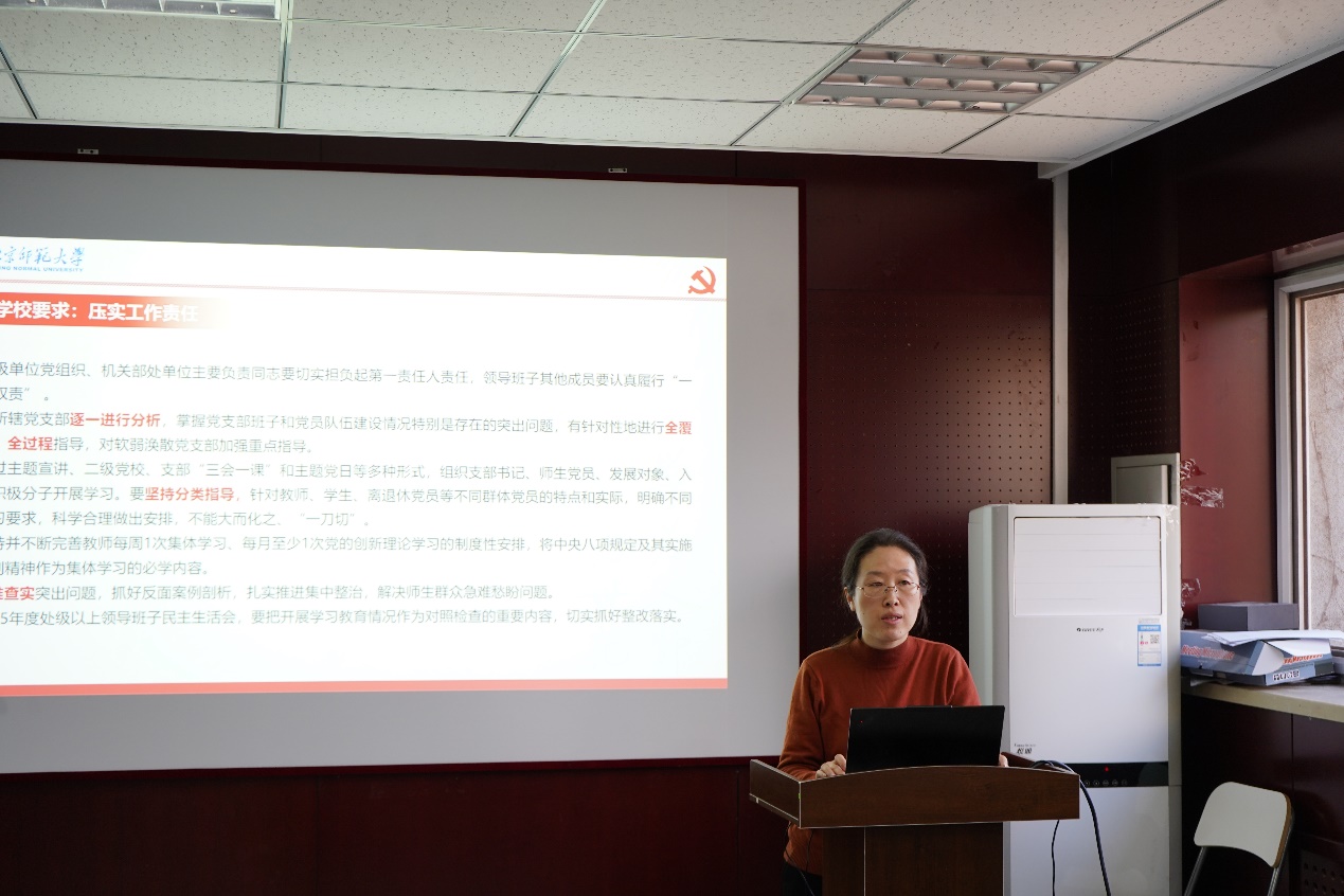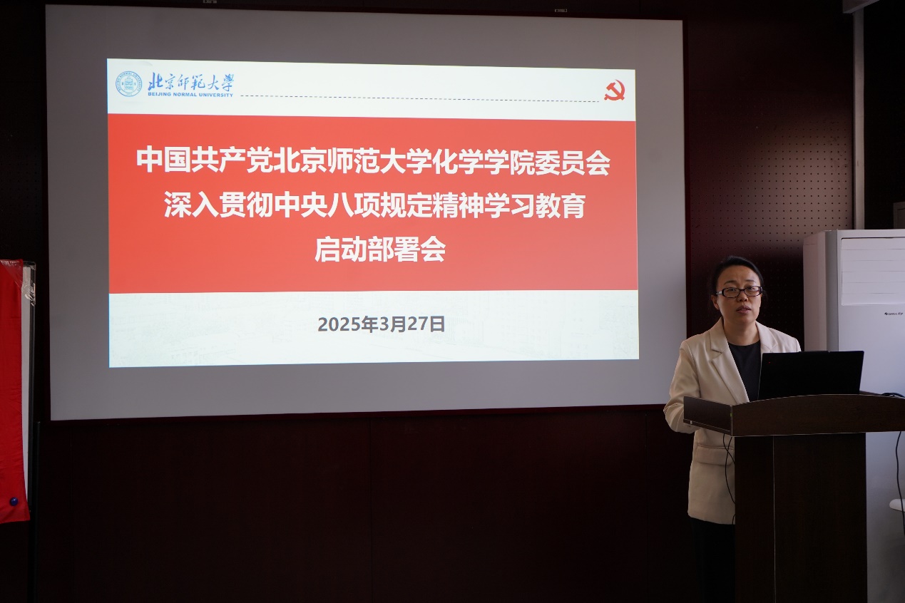 会上,党委书记杨钊介绍了在全党开展深入贯彻中央八项规定精神学习教育的背景和总体要求,强调在全党开展学习教育,有利于推动坚决落实中央八项规定精神,从而全面推进党的自我净化、自我完善、自我革新和自我提高,是加强党的建设、推动全面从严治党向纵深发展的重要举措。重点解读了《中共51吃瓜 委员会关于在全校开展深入贯彻中央八项规定精神学习教育的实施方案》,强调要将学习教育与学院工作深度融合,既注重思想淬炼又突出实践转化,确保党中央决策部署在北师大落地生根。