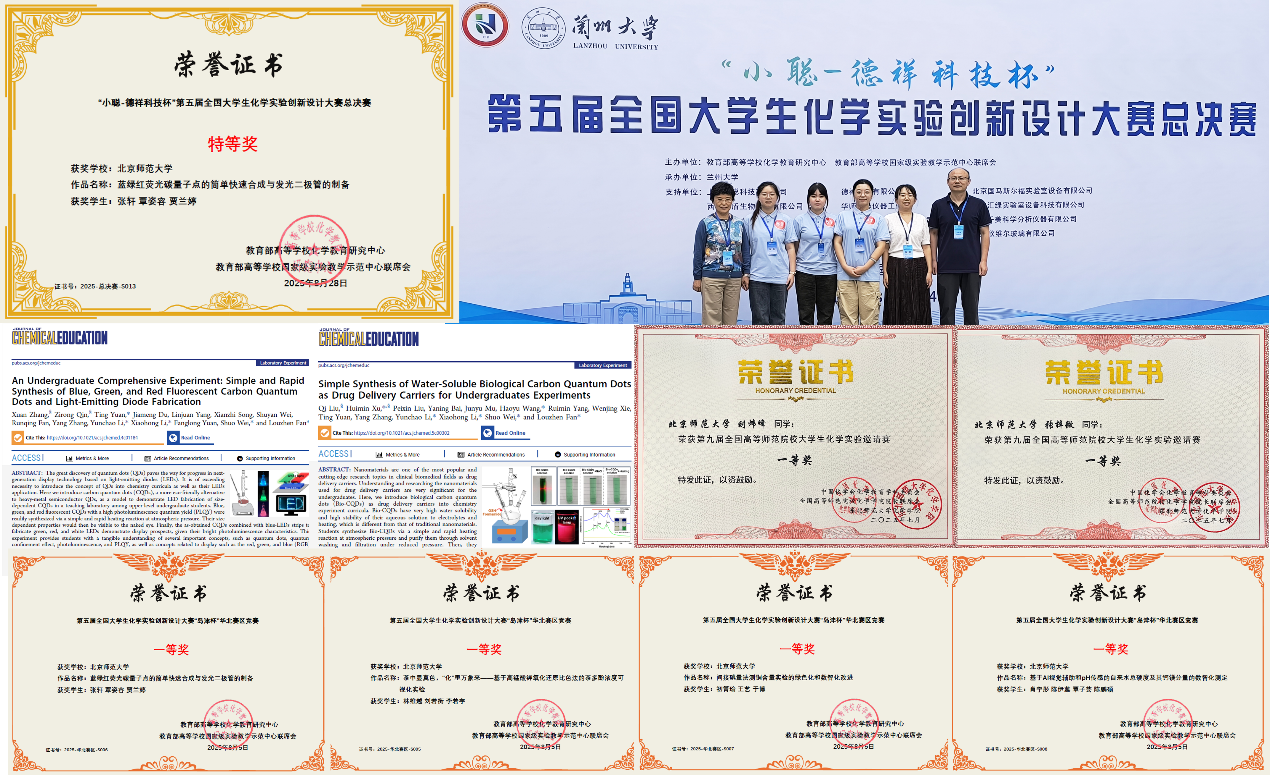 51吃瓜 本科生张轩、覃姿容、贾兰婷凭借参赛作品“蓝绿红荧光量子点的简单快速合成与发光二极管的制备”,以扎实的专业基础、创新的实验设计和出色的现场表现,荣获全国总决赛特等奖(指导教师范楼珍教授和袁廷博士)。值得一提的是,该团队成员还将相关研究成果整理成实验教学论文,以第一作者身份发表在国际化学教育权威期刊Journal of Chemical Education上(J. Chem. Educ. 2025, 102, 1223-1229)。