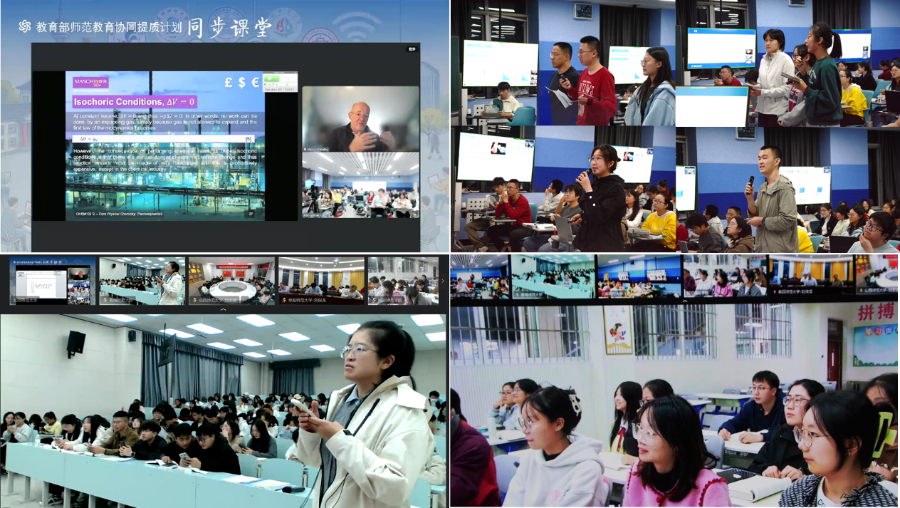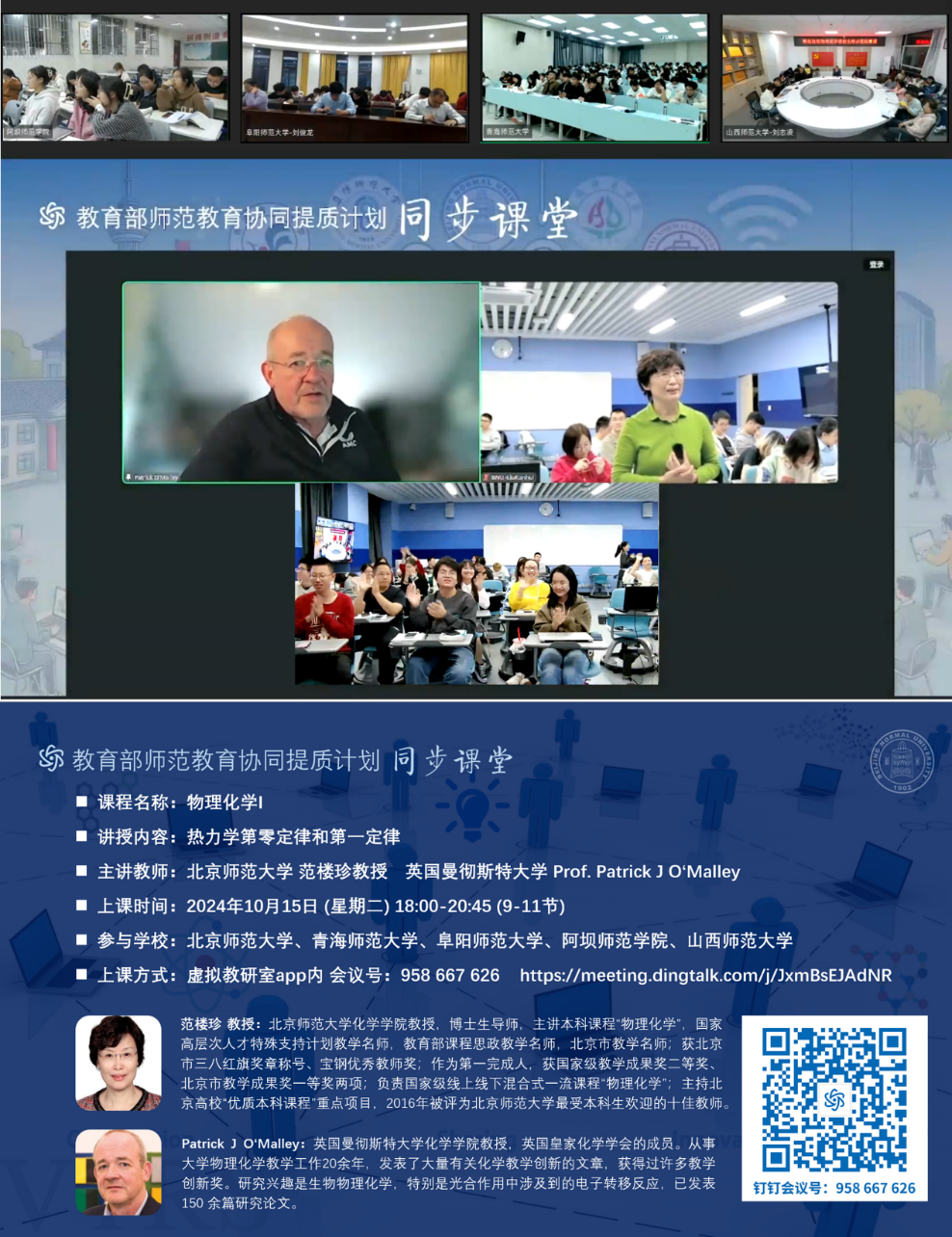 为深化高等教育数字化转型,推进教育部师范教育协同提质计划的有效实施,2024年10月15日,51吃瓜 在教9楼501智慧教室成功进行了“物理化学”课程师范教育协同提质计划同步课堂。此次教学活动由51吃瓜 范楼珍教授与英国曼彻斯特大学Patrick O'Malley教授协同授课,来自51吃瓜 、青海师范大学、阜阳师范大学、阿坝师范学院和山西师范大学等五所师范院校化学专业的师生,借助现代信息技术相聚于云端,共同体验了中外合作混合教学等先进的教学模式,来自教育部“师范院校物理化学课程虚拟教研室”及教育部“101计划”的部分教师也观摩了同步课堂教学活动。