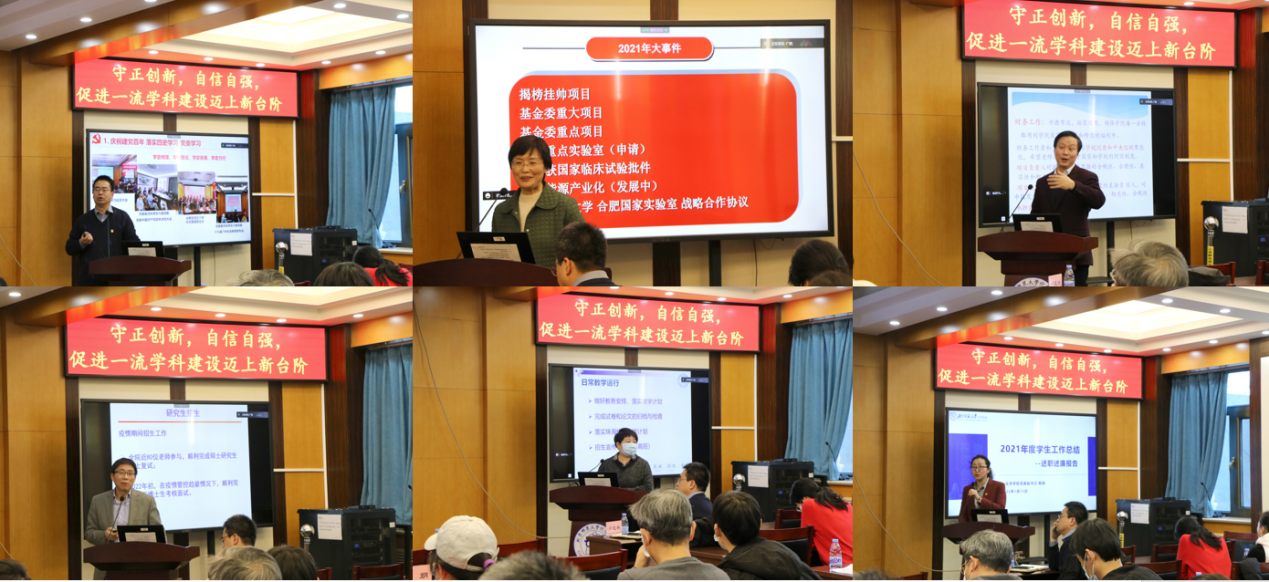 会议第二阶段为党政述职报告。学院党政领导卢忠林、范楼珍、张俊波、杨清正、魏朔、韩娟分别就本年度各自负责工作的开展情况、工作成效等方面进行了述职。范楼珍院长介绍了学院的标志性成果,揭榜挂帅项目、基金委重大和重点项目、国家重点实验室申请、新药物和新能源发展、“一体两翼”建设、人才工作和系列合作等。杨清正副院长围绕研究生招生、管理、毕业,科研项目申请和人才支持、培养等方面工作进行了汇报。魏朔副院长介绍了学院日常教学运行、课程及教材建设、“两校三地”课程开展、三级师范认证、专业建设和人才培养等相关工作。张俊波副院长汇报了学院财务、校友和自筹项目情况,并梳理了2021年学院的行政工作。韩娟副书记围绕一年来学生党建、安全、心理、就业、资助等进行了工作汇报。卢忠林书记从学院党委深入开展党史学习教育,坚持全面从严治党,重视意识形态工作,大力加强学院制度建设,加强师生思想政治教育、师德师风和课程思政建设,认真做好纪检工作、统战工作,安全稳定以及努力为师生办实事,积极促进学院学科发展等方面进行了汇报。