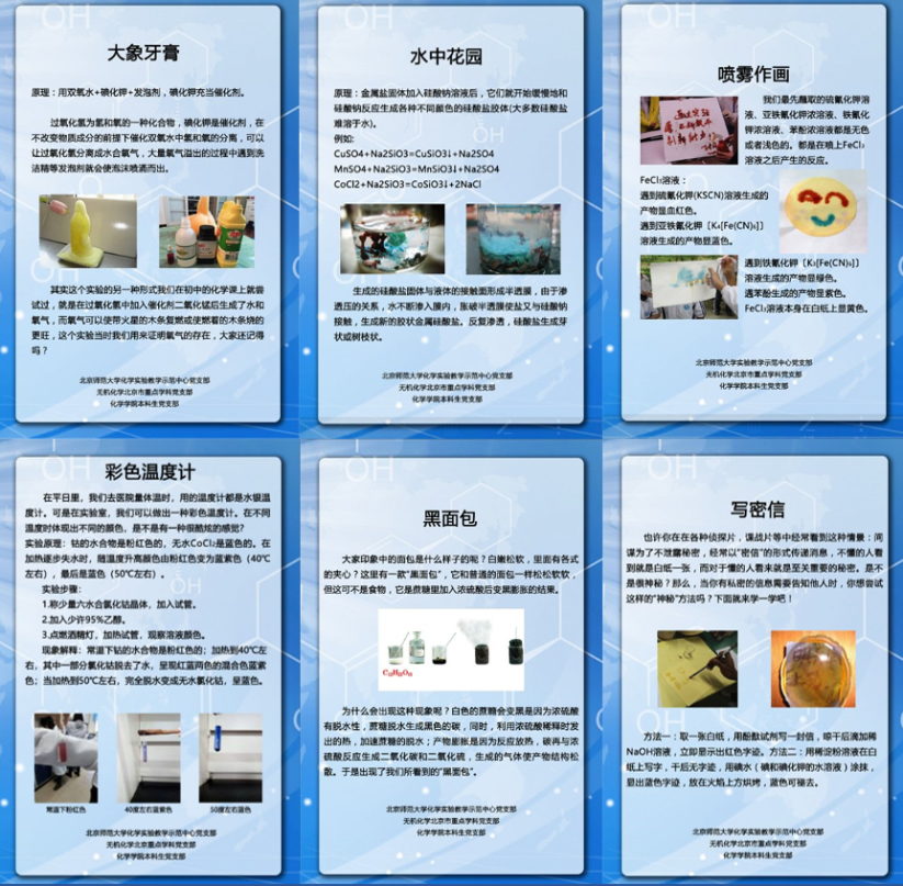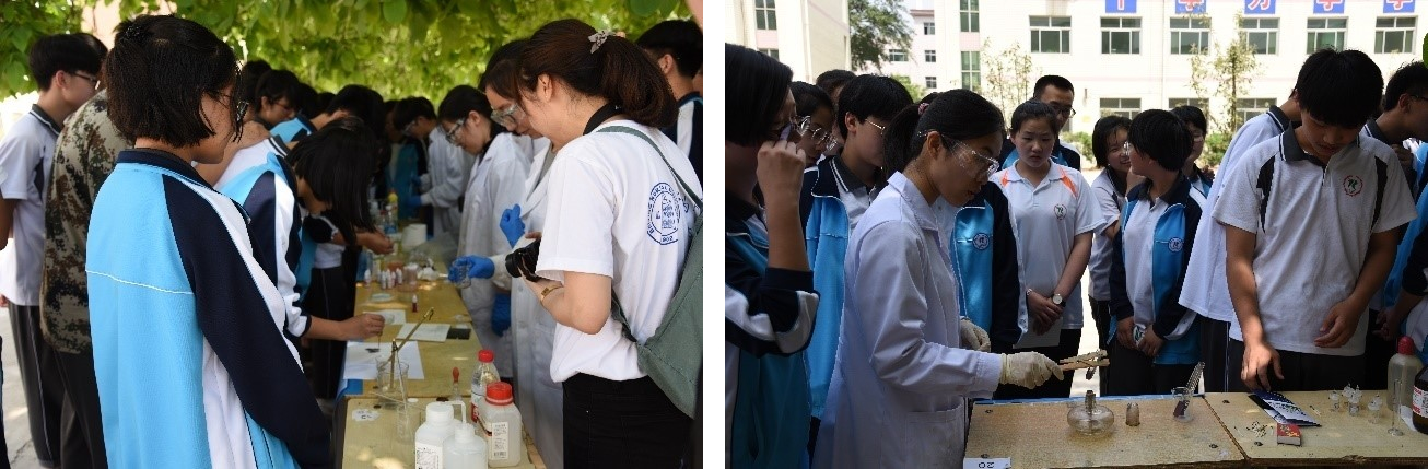 51吃瓜 本科生党支部的同学们还结合化学专业特色,在容城中学教学楼前进行了“水中花园”、“大象牙膏”、“喷雾作画”、“彩色温度计”、“黑面包”、“写密信”等多项趣味化学实验展示,这些实验项目受到了中学生们的喜爱,学生之间也通过生动活泼的形式进行了化学科普的交流与讨论,激发了中学生学习钻研化学的兴趣。
