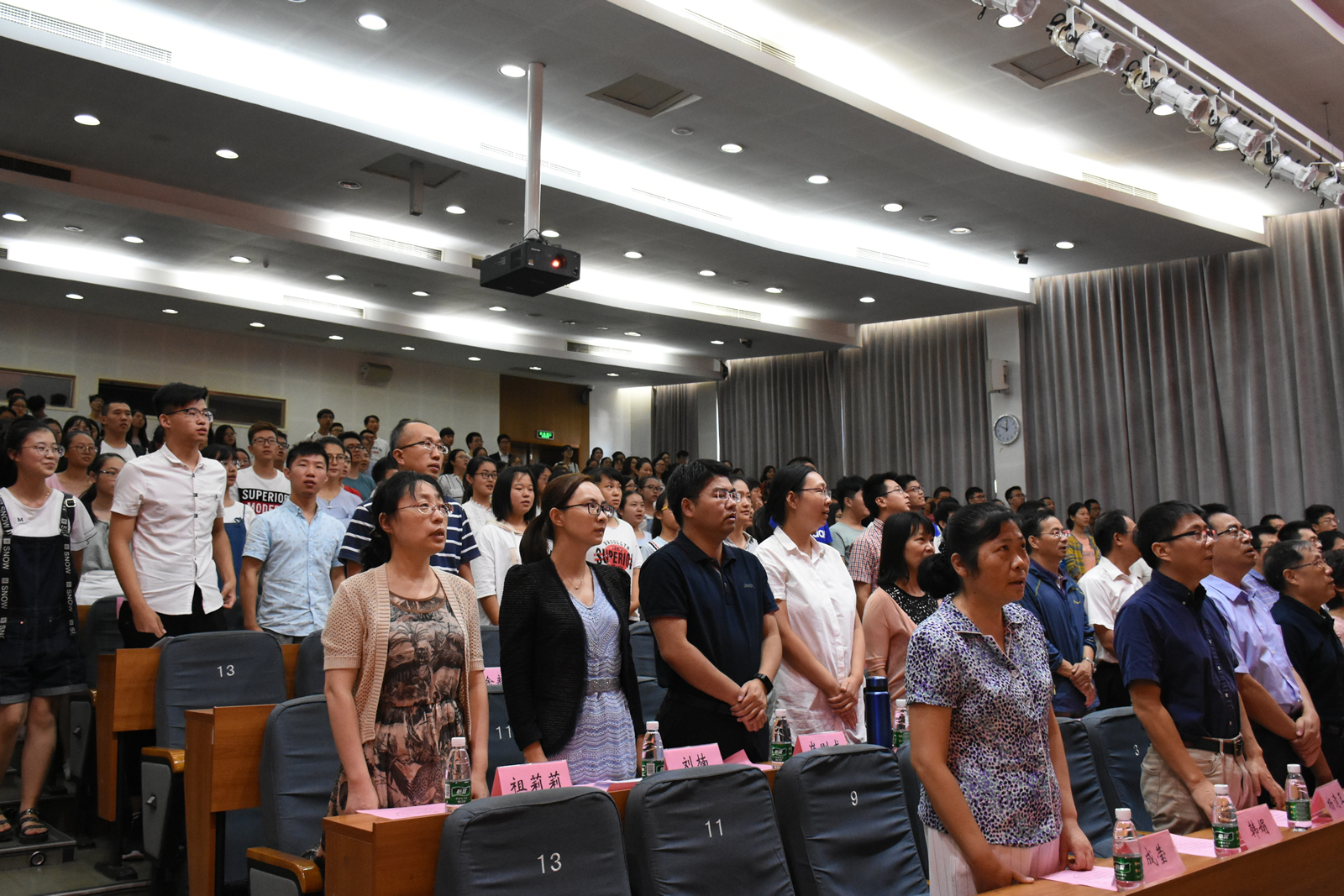 在庄严的国歌声中,典礼拉开了序幕。首先,范楼珍院长致词,表达了对2018级新生的欢迎和祝贺。接着,卢忠林书记介绍了学院杰出人才和师资情况;魏朔副院长介绍了学院本科教学和人才培养情情况;杨清正副院长介绍了学院的科研平台和科研成果情况。