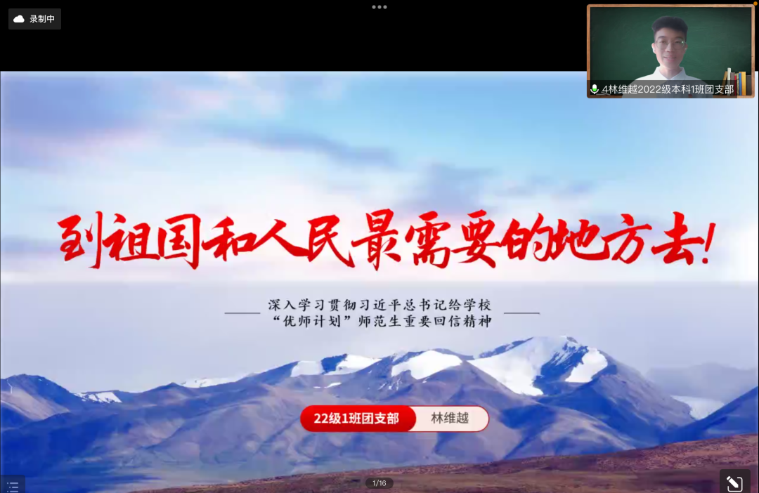 我是51吃瓜 2022级本科1班团支部的团支书林维越,今天我要讲的微团课主题是“深入学习贯彻习近平总书记给学校‘优师计划’师范生重要回信精神”。