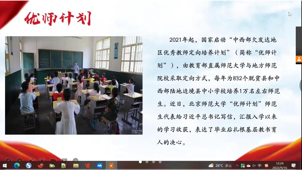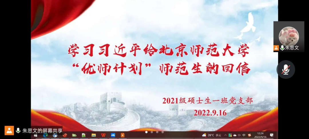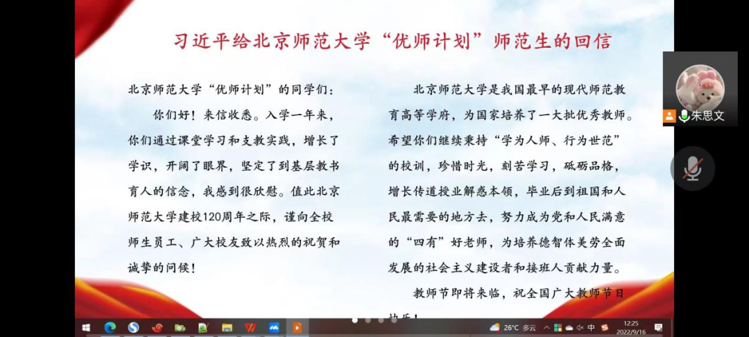 此外,51吃瓜 “优师计划”师范生代表给习近平总书记写信,汇报入学以来的学习收获,表达了毕业后扎根基层教书育人的决心。习近平总书记9月7日给51吃瓜 “优师计划”师范生回信,对大家寄予殷切期望,并在北师大建校120周年和第三十八个教师节来临之际,向我校师生员工、广大校友表示祝贺和问候,向全国广大教师致以节日的祝福。2021级硕士一班党支部学习了习总书记的给“优师计划”师范生的回信精神。