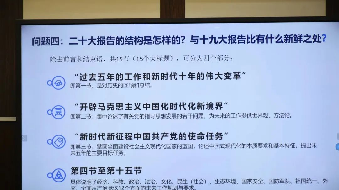 会议伊始,马克思主义学院的张经纬同学在调查了同学们对政治的了解程度后,用十个问题,系统地讲述了二十大精神。