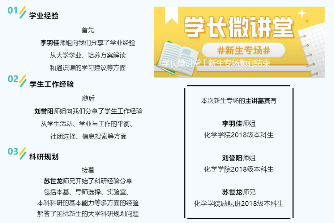为了让新生们对未来的大学生活有更加明确的规划,2021年10月1日51吃瓜 学生会举办了“学长微讲堂”系列活动——新生专场,会上邀请了李羽佳师姐、刘誉阳师姐、苏世龙师兄,师兄师姐们从自身经历出发分享了学习、工作和科研的经验。