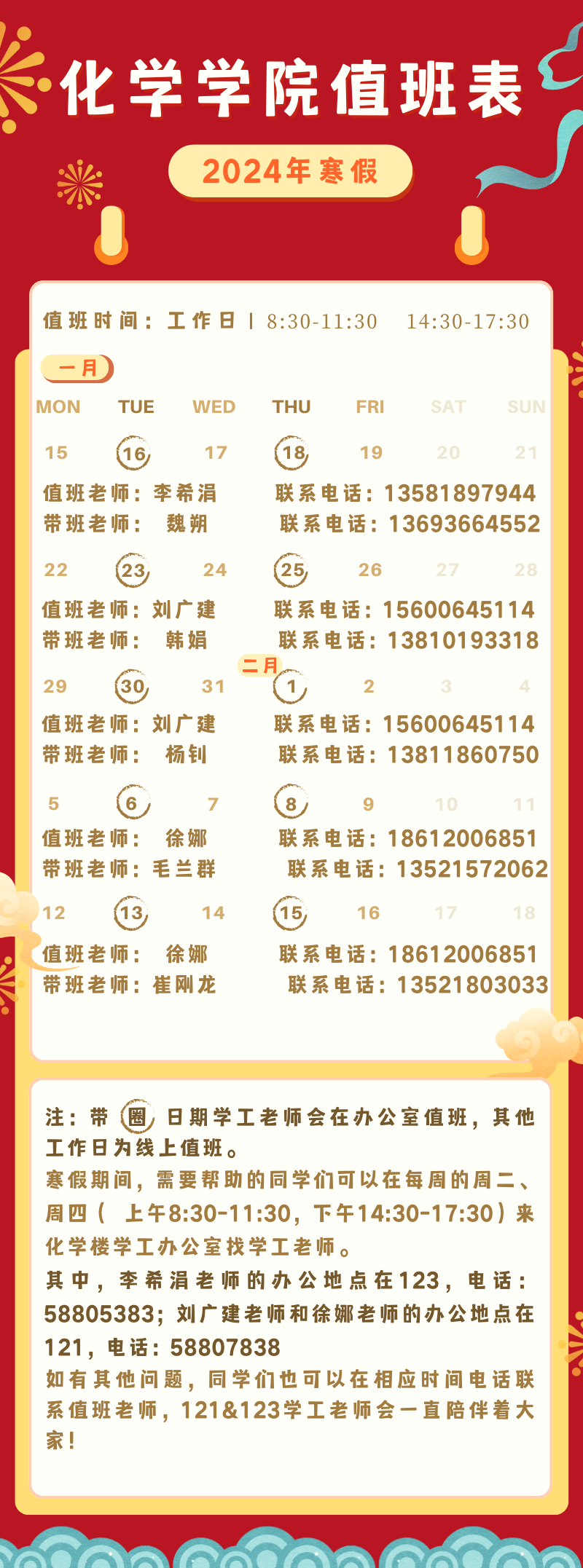 寒假期间,需要帮助的同学们可以在每周的周二、周四( 上午8:30-11:30,下午14:30-17:30)来化学楼学工办公室找学工老师。