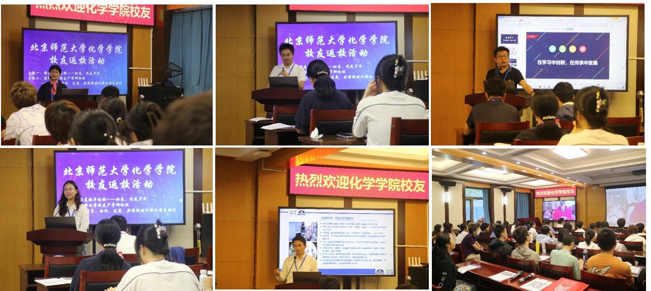 第三阶段有三项活动平行进行。秩年校友到邱季端体育馆参加学校秩年校友返校纪念大会;部分校友参观校史馆;部分校友在化学楼二楼会议室为在校生开展分享和宣讲活动。北京师范大学校长马骏、副校长周作宇、校友总会副会长陈光巨、51吃瓜 党委书记卢忠林等出席秩年返校纪念大会,马骏校长代表学校致辞,欢迎校友们回家,介绍学校近年来发展情况;校友总会组织师生校友代表开展了诗朗诵《师大和你》,四重唱《相逢是首歌》等,制作了秩年微电影与老照片展览。学院党委副书记韩娟主持校友分享和宣讲活动,50余名在校生聆听了校友代表的精彩分享。中国医学院科学院药物研究所副所长黄海洪校友、转化医学国家重大科技基础设施(北京协和)诊疗新技术研发转化平台主任张现忠校友、柳州高级中学教师覃睿校友、北京理工大学在读博士李玮昱校友、威海晨源分子新材料有限公司创始人兼总经理李武松校友介绍了自己的成长经历和工作领域,分享了工作心得和创业心得,寄语同学们要树立崇高理想,勇于创新、勇于坚持,努力学习,服务社会。