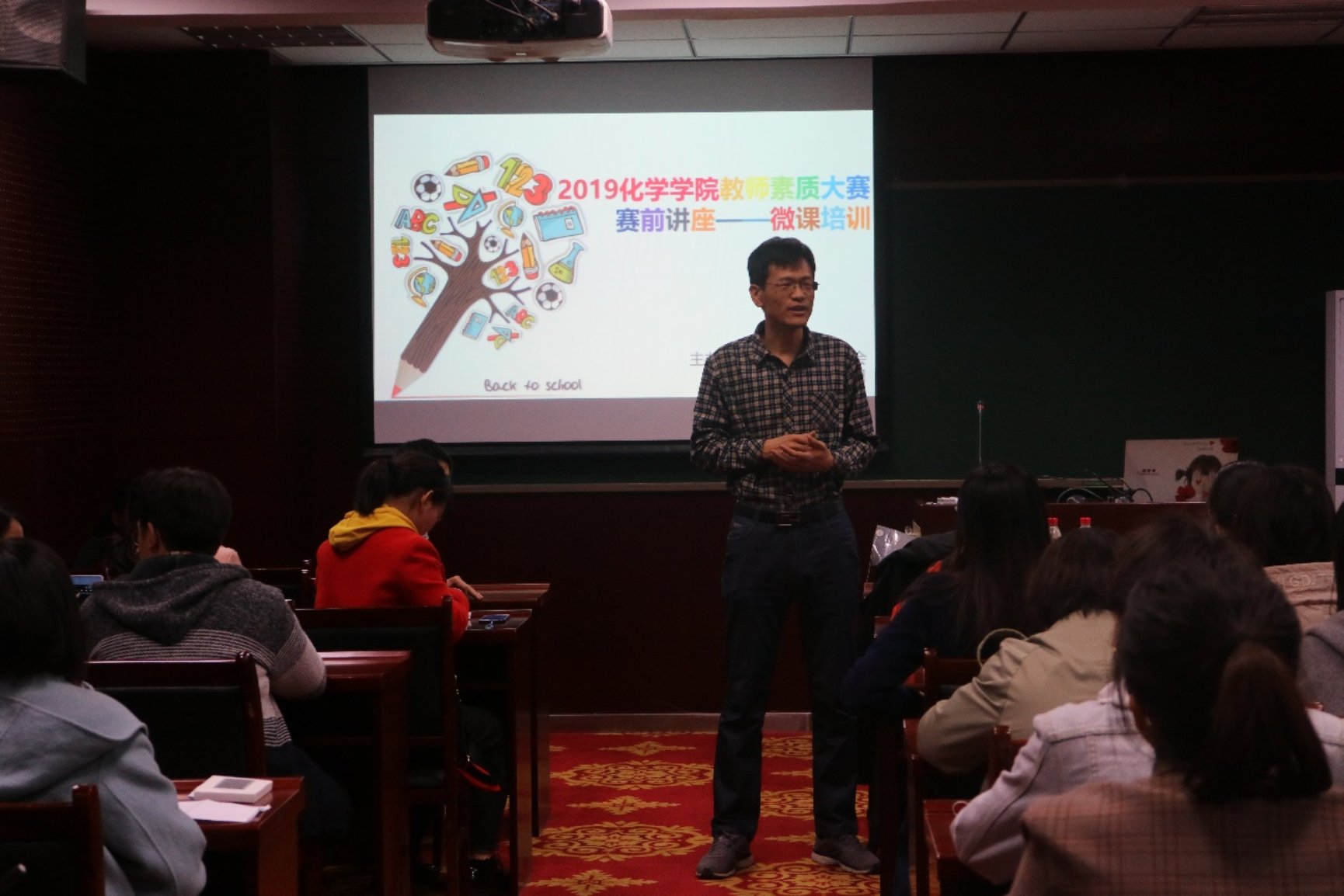赛前“微课培训”于2019年4月2日在化学楼东小院二层会议室举行,化学学院魏锐老师通过深入浅出的教学案例,生动形象的教授了“如何讲好微课”。魏老师讲到完整的教学环节分为4部分:引入,展开,高潮,总结,每一部分都不可缺少;在课堂中,学生应该有角色代入,鼓励老师在情景中教学,让学生以科学家工程师等角色进行探究问题,激发学生的学习兴趣。魏老师的对微课的讲解面面俱到,条理清晰,学生深受启发。